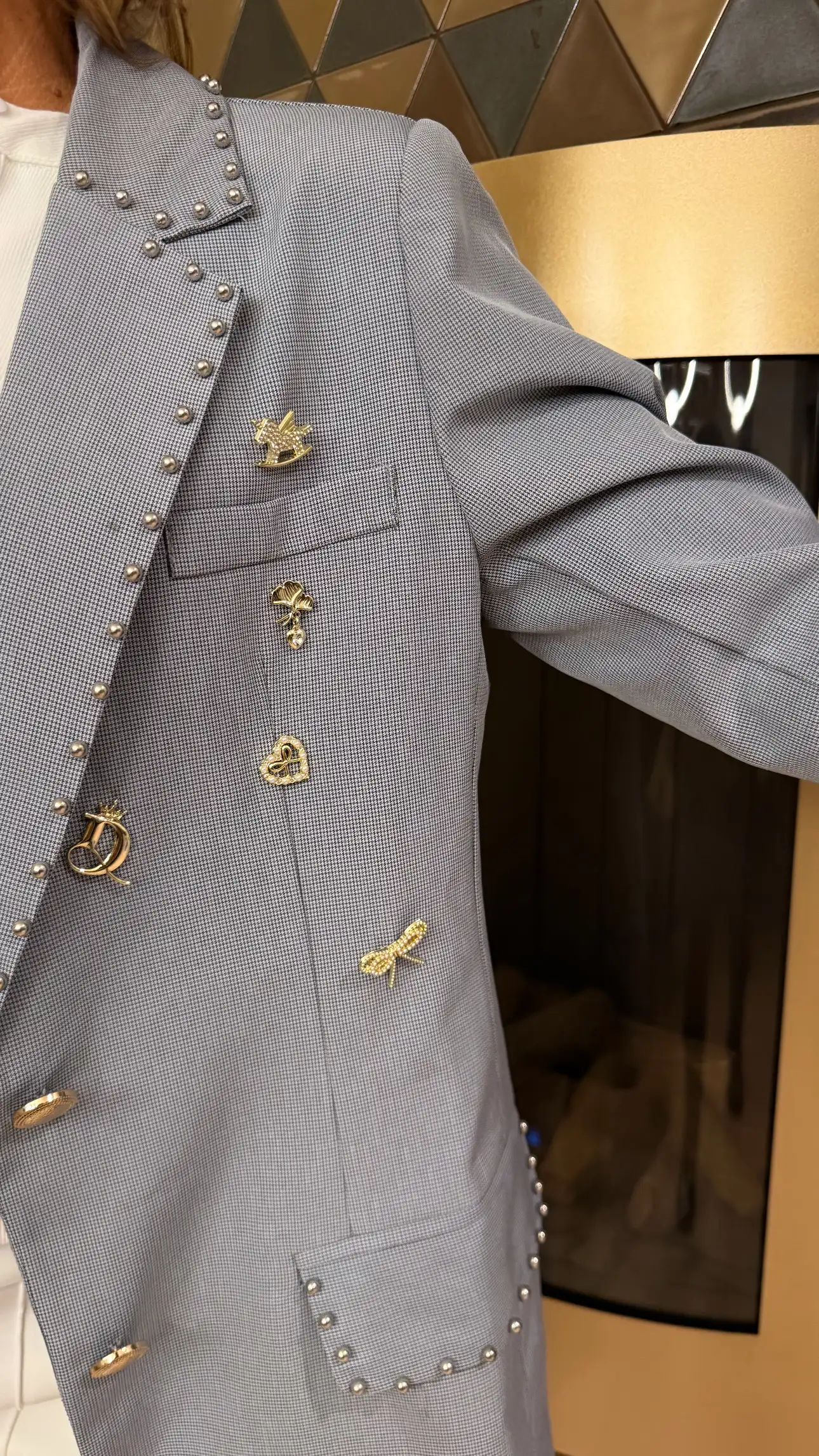 Een elegante blazer met een edgy twist. De blazer is omlijnd met verfijnde studs en decoratieve broches, wat zorgt voor een luxueuze uitstraling. De gouden knopen geven het geheel een chique finishing touch en maken dit item perfect voor zowel een statement look overdag als een stijlvolle avondoutfit.
