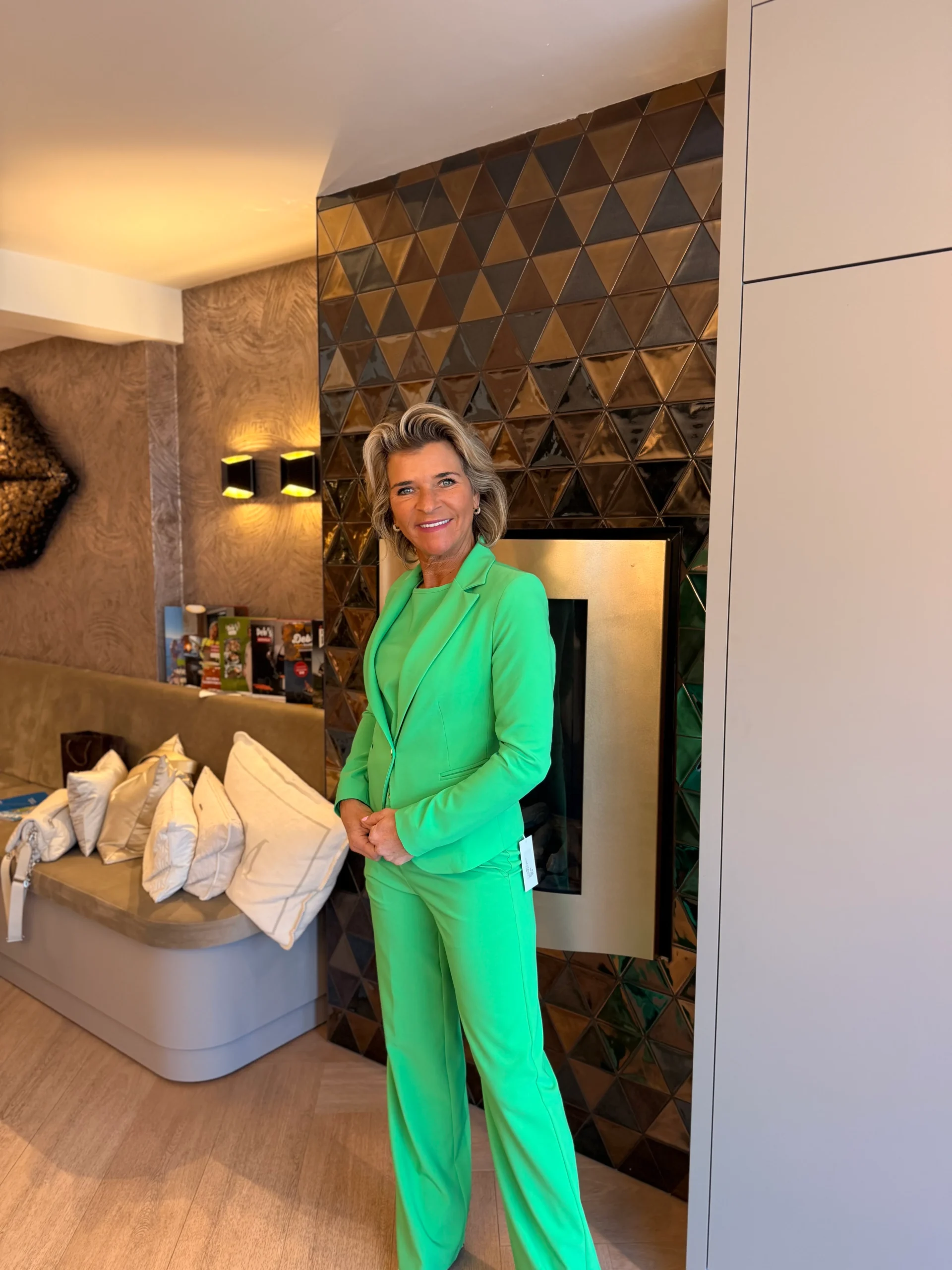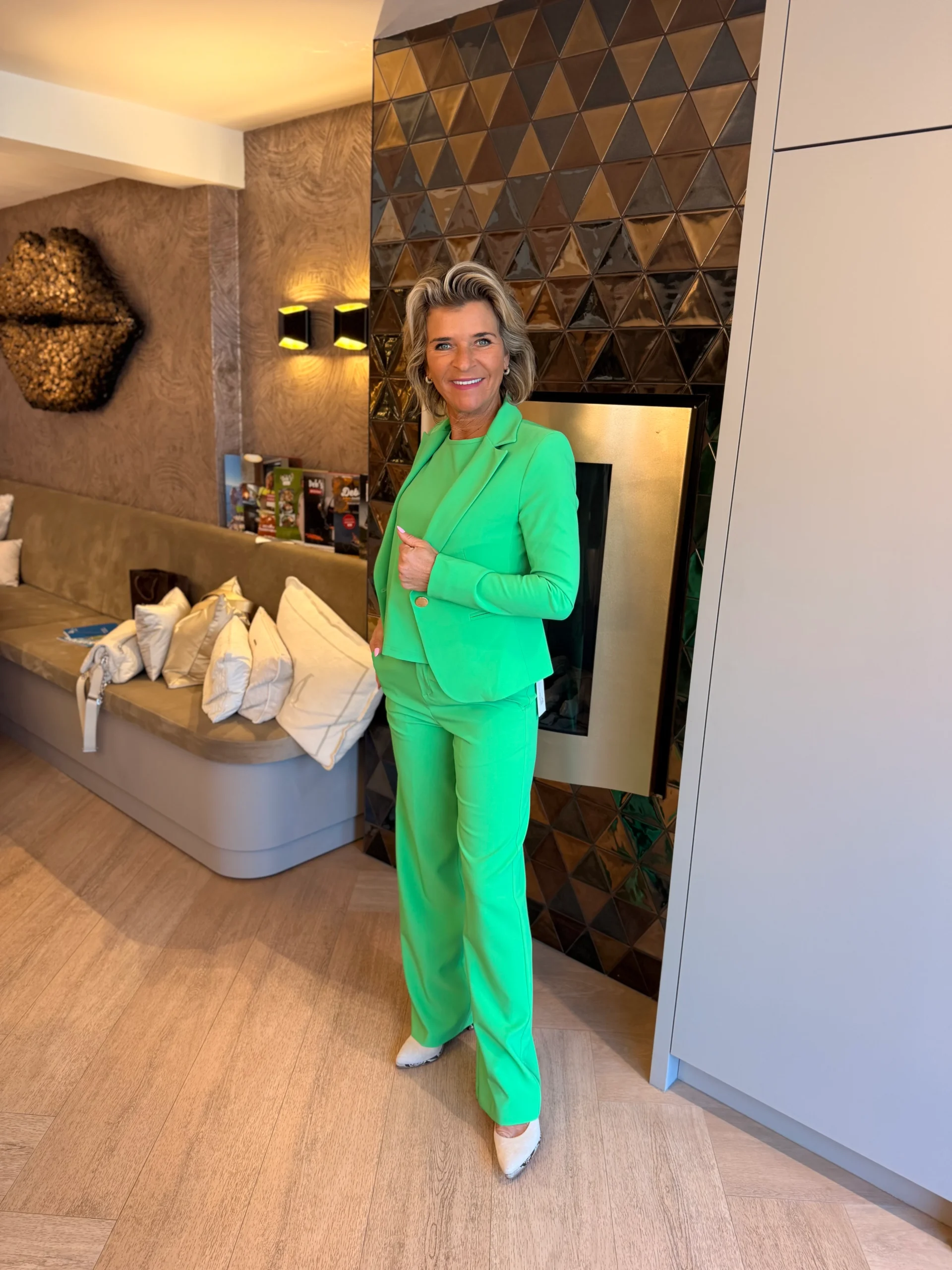 De blazer is perfect te combineren met de bijpassende jumpsuit of pantalon en maakt de look compleet, of je nu kiest voor een chique of meer eigentijdse uitstraling.