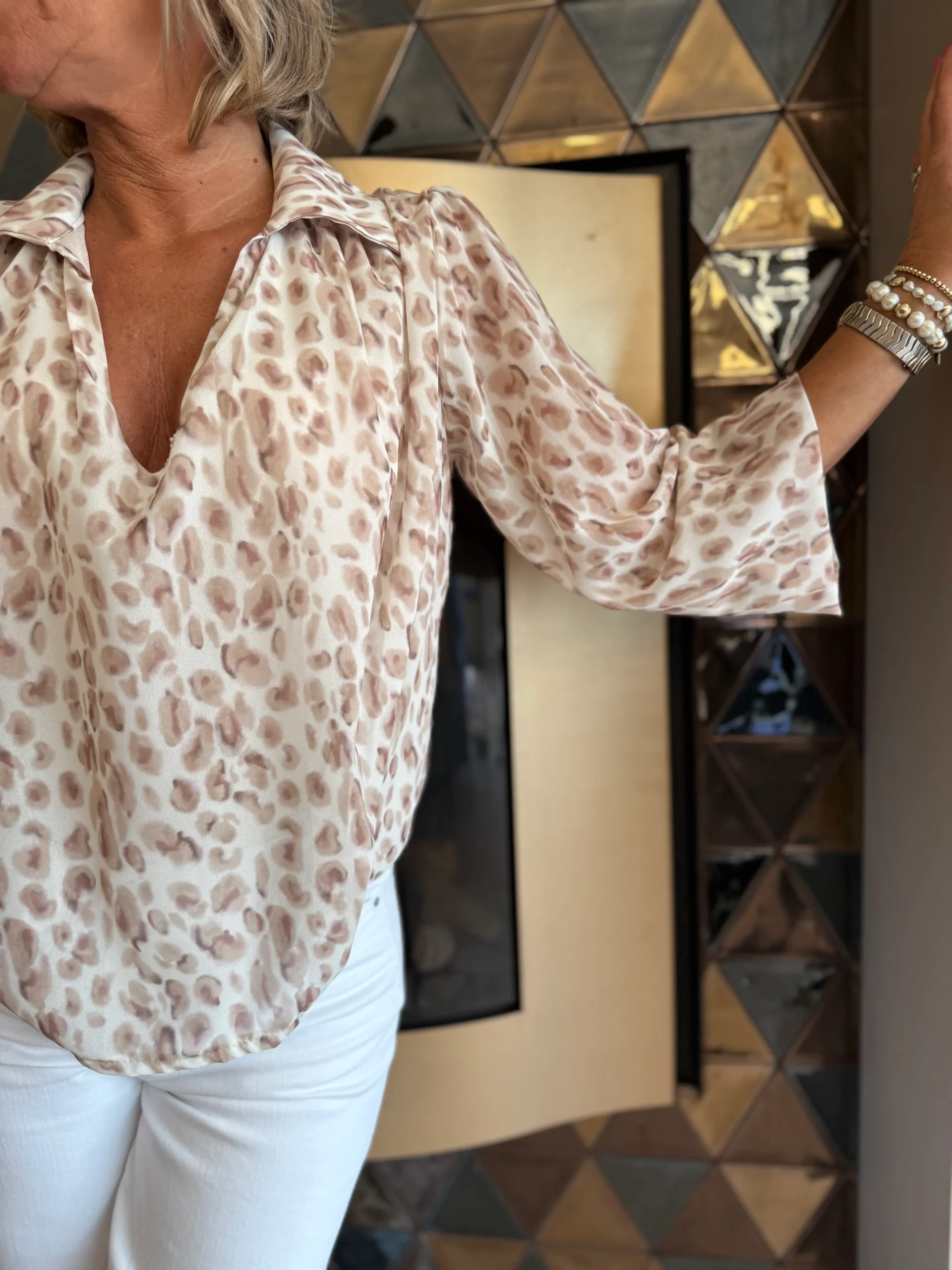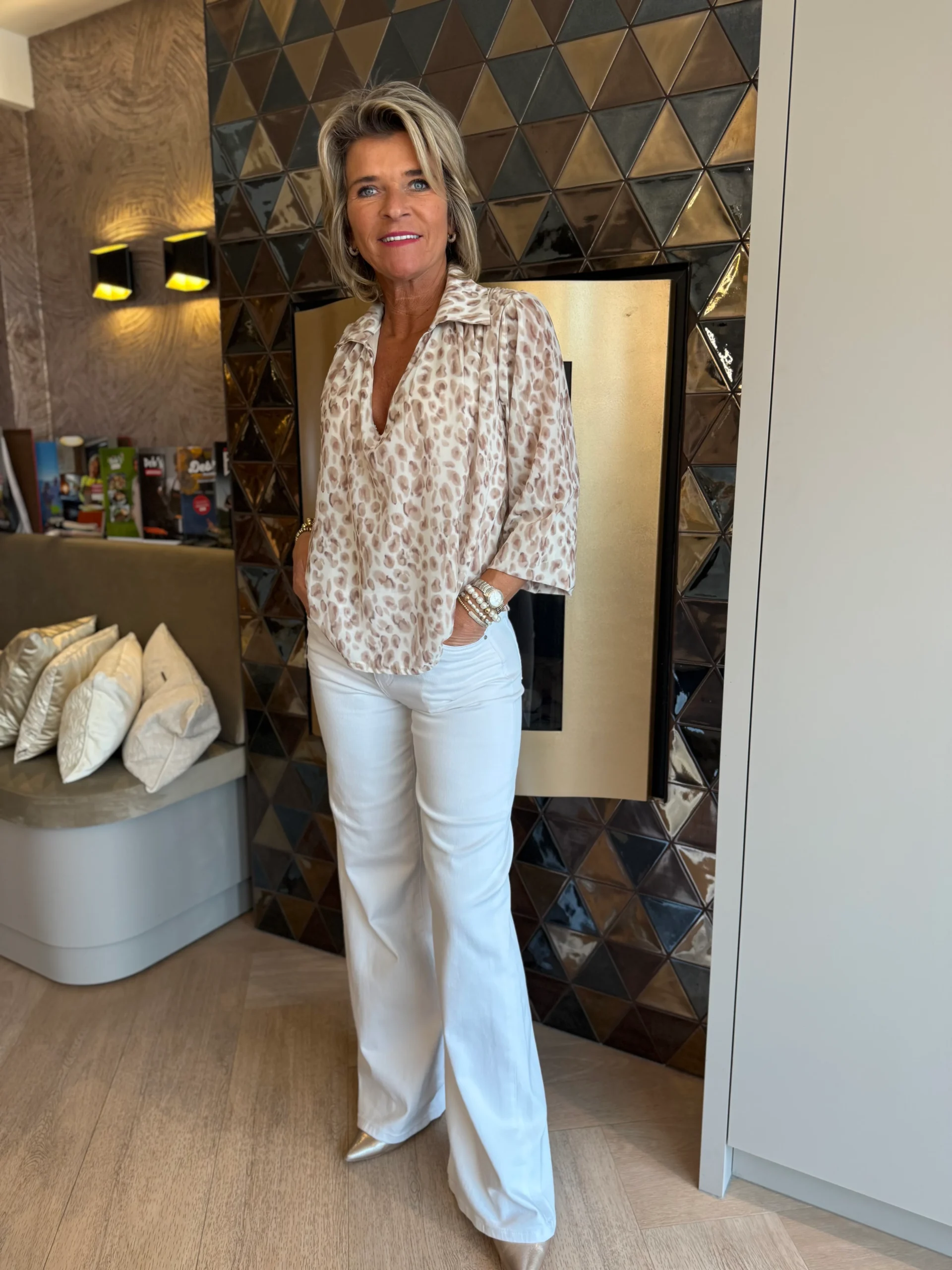 Deze elegante blouse is gemaakt van een luchtige voile stof, wat zorgt voor een soepele en verfijnde uitstraling. Het model heeft een V-hals met kraag, wat de blouse een stijlvolle en vrouwelijke look geeft. De mouwen vallen soepel en zijn afgewerkt met een elastische boord, waardoor ze mooi in vorm blijven en comfortabel dragen. Dankzij de lichte, vloeiende stof is deze blouse perfect te combineren voor zowel een casual als een geklede outfit.