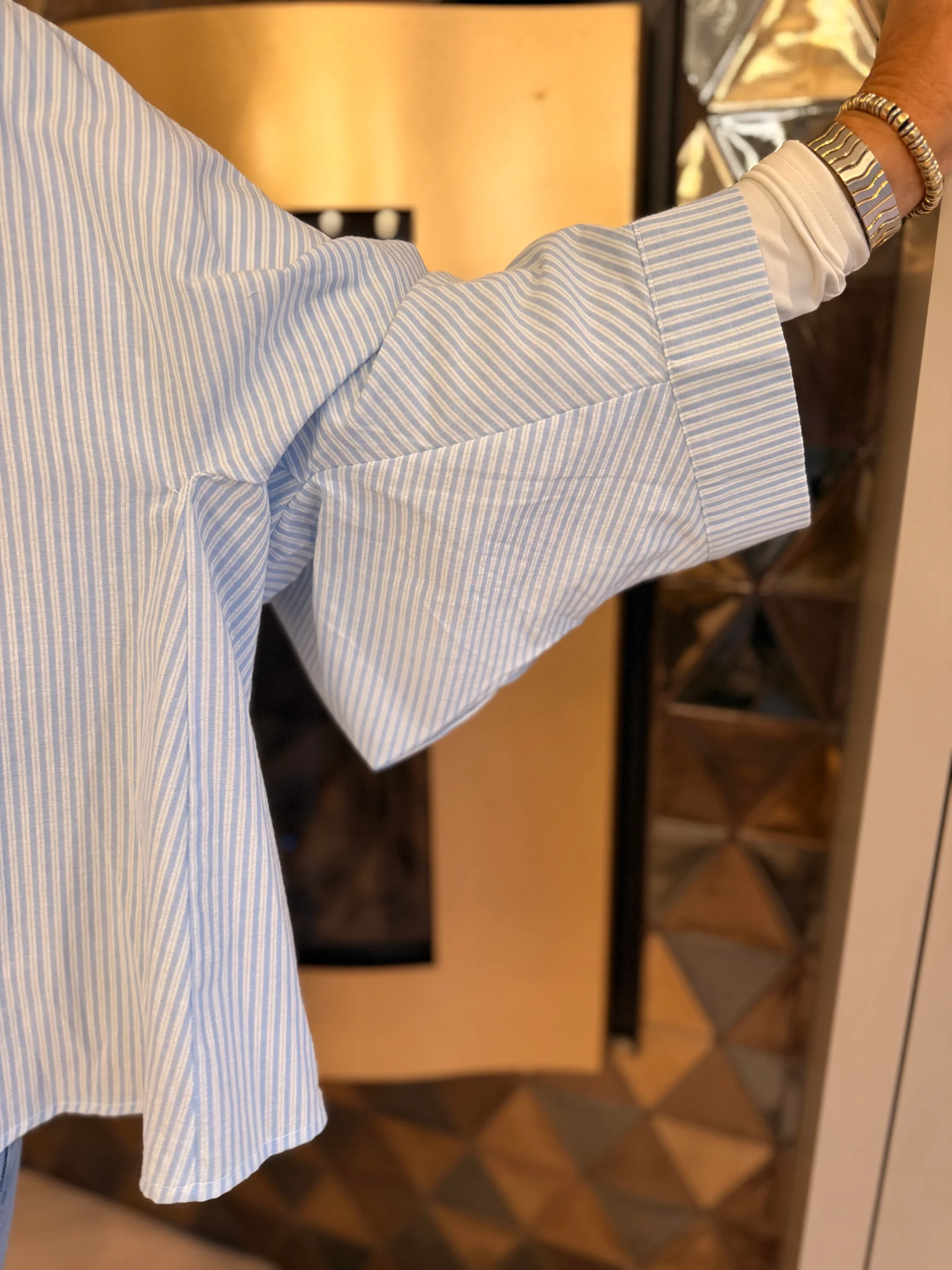 Wijde gestreepte blouse met kraag en een eigentijdse, losse fit. De mouwen zijn aan het voorpand bevestigd en hebben een vierkant borstzakje, wat zorgt voor extra wijdte. Onderaan zijn de mouwen afgewerkt met een split en een boordje. Het achterpand heeft een pas met een plooi in het midden voor een soepel vallend effect. De blouse loopt aan de voorkant recht en aan de achterkant rond. One size en draagbaar tot en met maat XXL. Lengte: 65 cm.