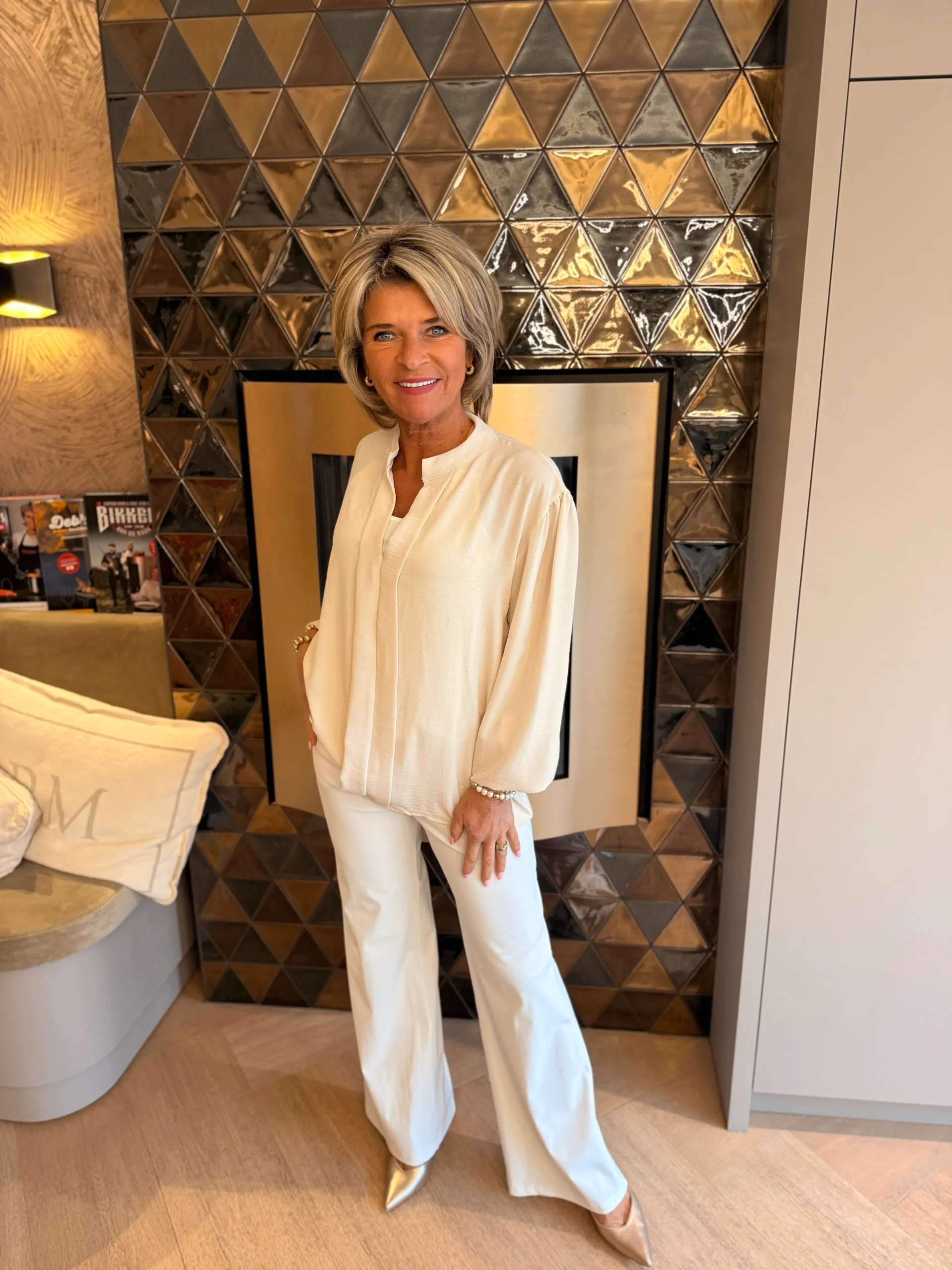 De blouse heeft lange mouwen die onderaan zijn afgewerkt met elastiek, waardoor ze mooi aansluiten en licht bloezend vallen. De ronde hals is voorzien van een subtiele split, wat zorgt voor een vrouwelijke en elegante uitstraling.