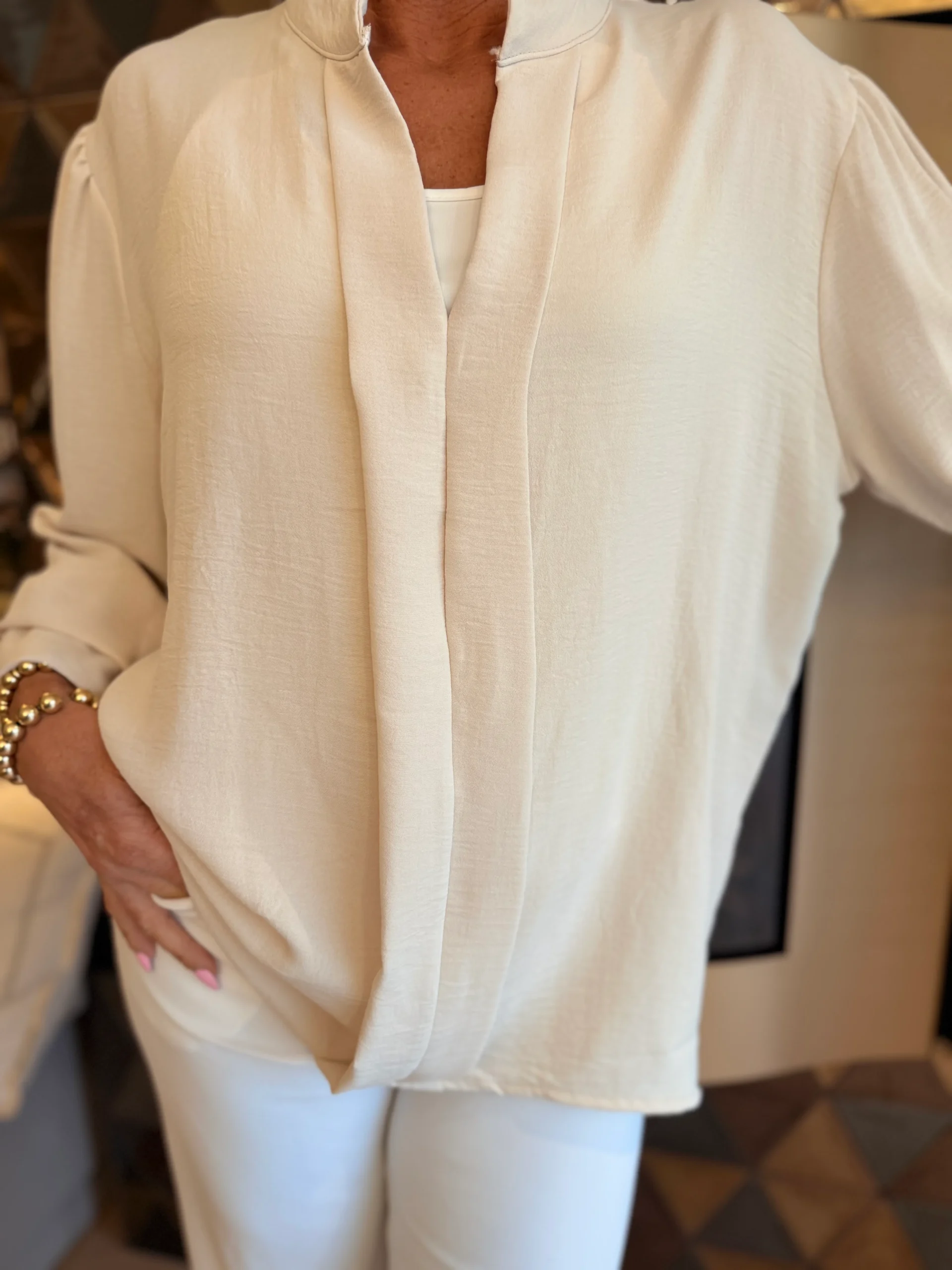 Op het voorpand loopt een dubbele bies die een speels en stijlvol effect geeft. De lengte van de blouse is circa 70 cm, waardoor hij mooi valt en zowel los als deels ingestopt gedragen kan worden.
