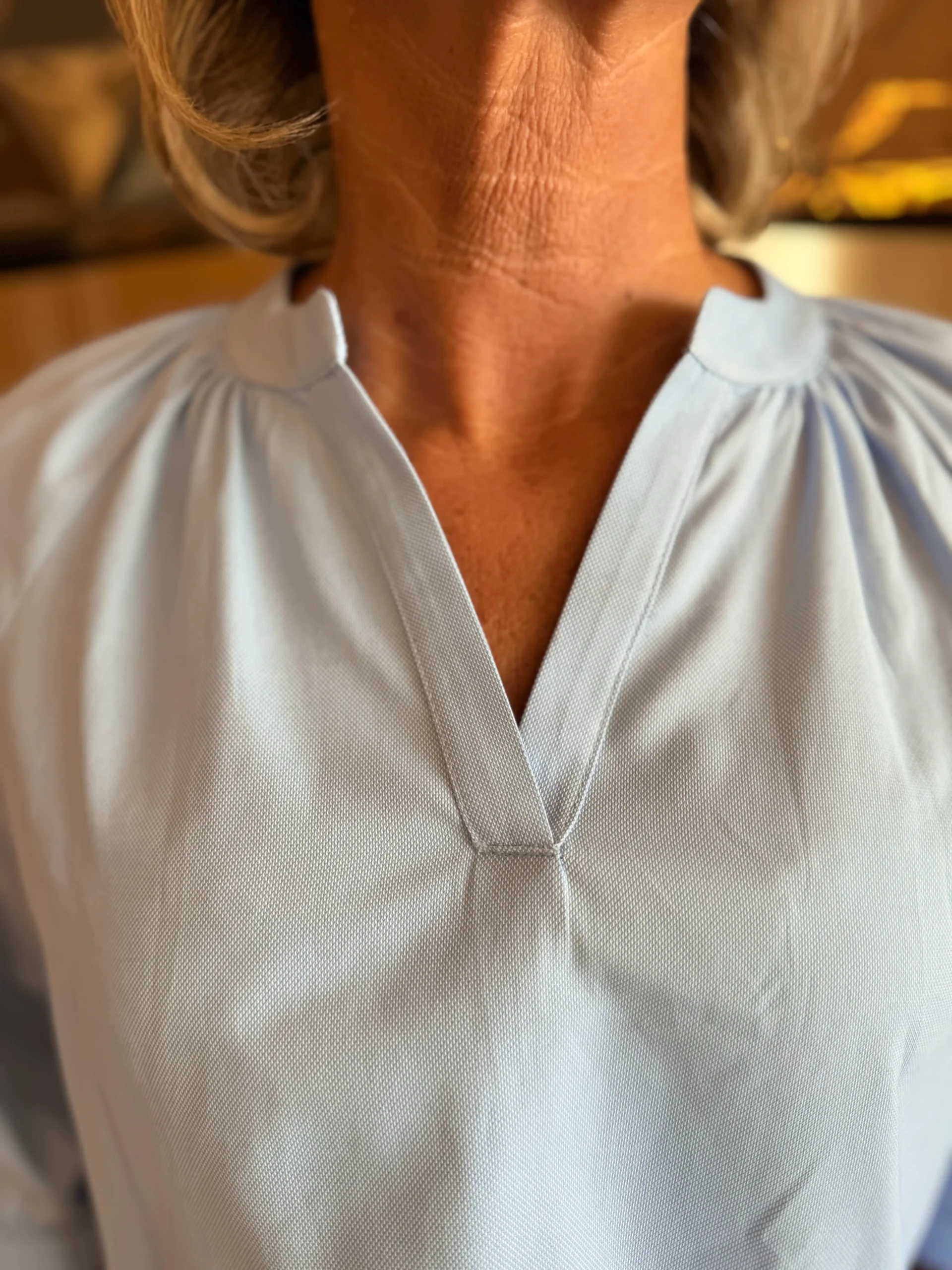 Deze blouse met een subtiel boordje en split heeft een verfijnde en moderne uitstraling. De onderkant loopt rond, wat zorgt voor een mooie, vloeiende pasvorm.