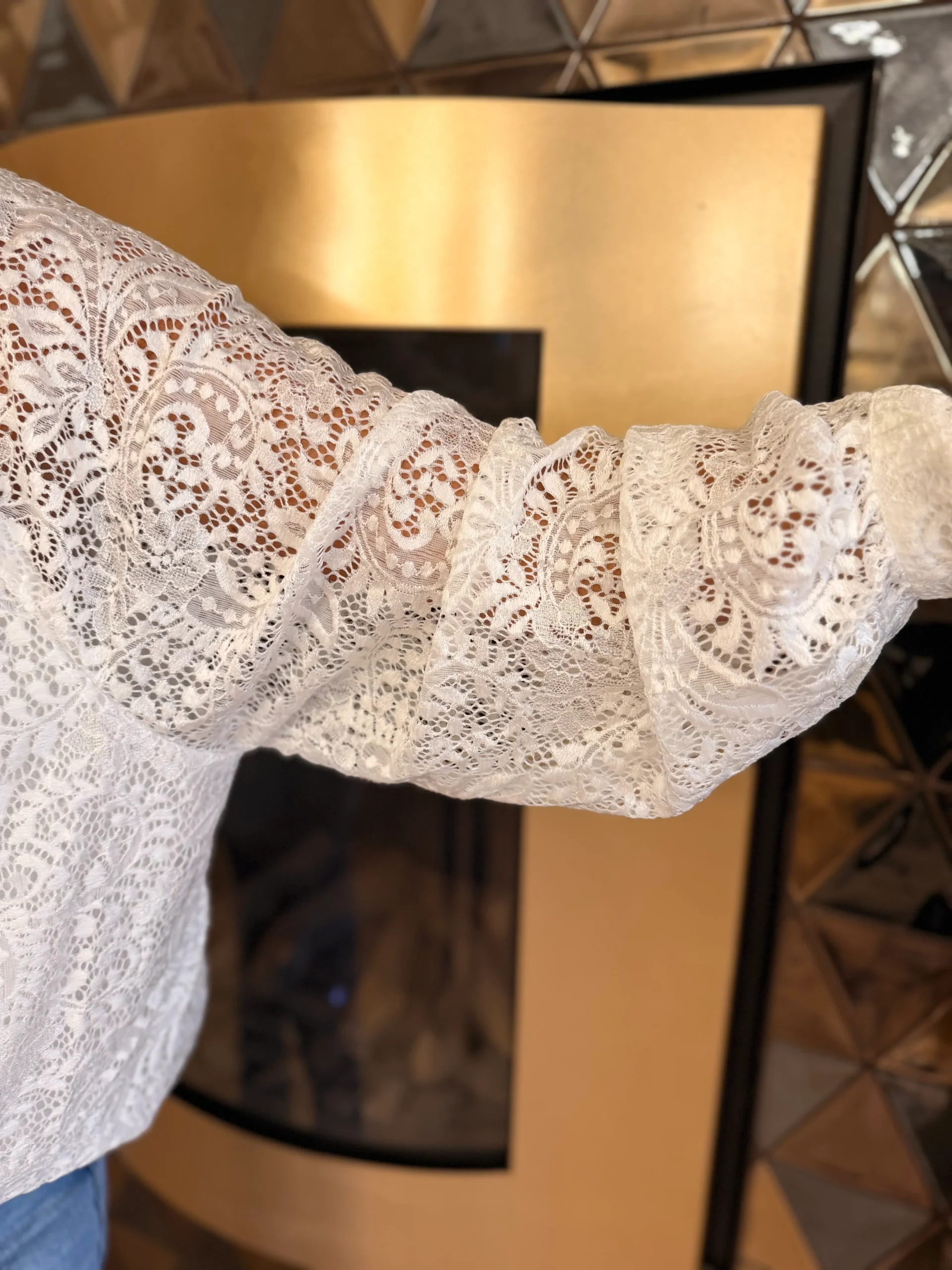 Deze romantische blouse van kant is een elegante toevoeging aan je garderobe. De blouse heeft een verfijnde boord met daaraan een brede strik voor een stijlvolle touch. De wijde mouwen lopen uit en zijn afgewerkt met een smal boordje bij de pols. Dankzij de voering draagt de blouse comfortabel en blijft hij netjes in model. Perfect voor zowel chique als casual looks.