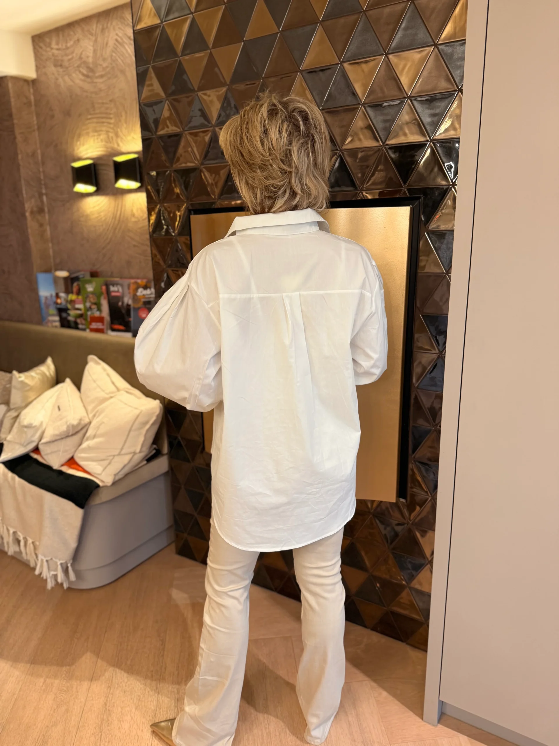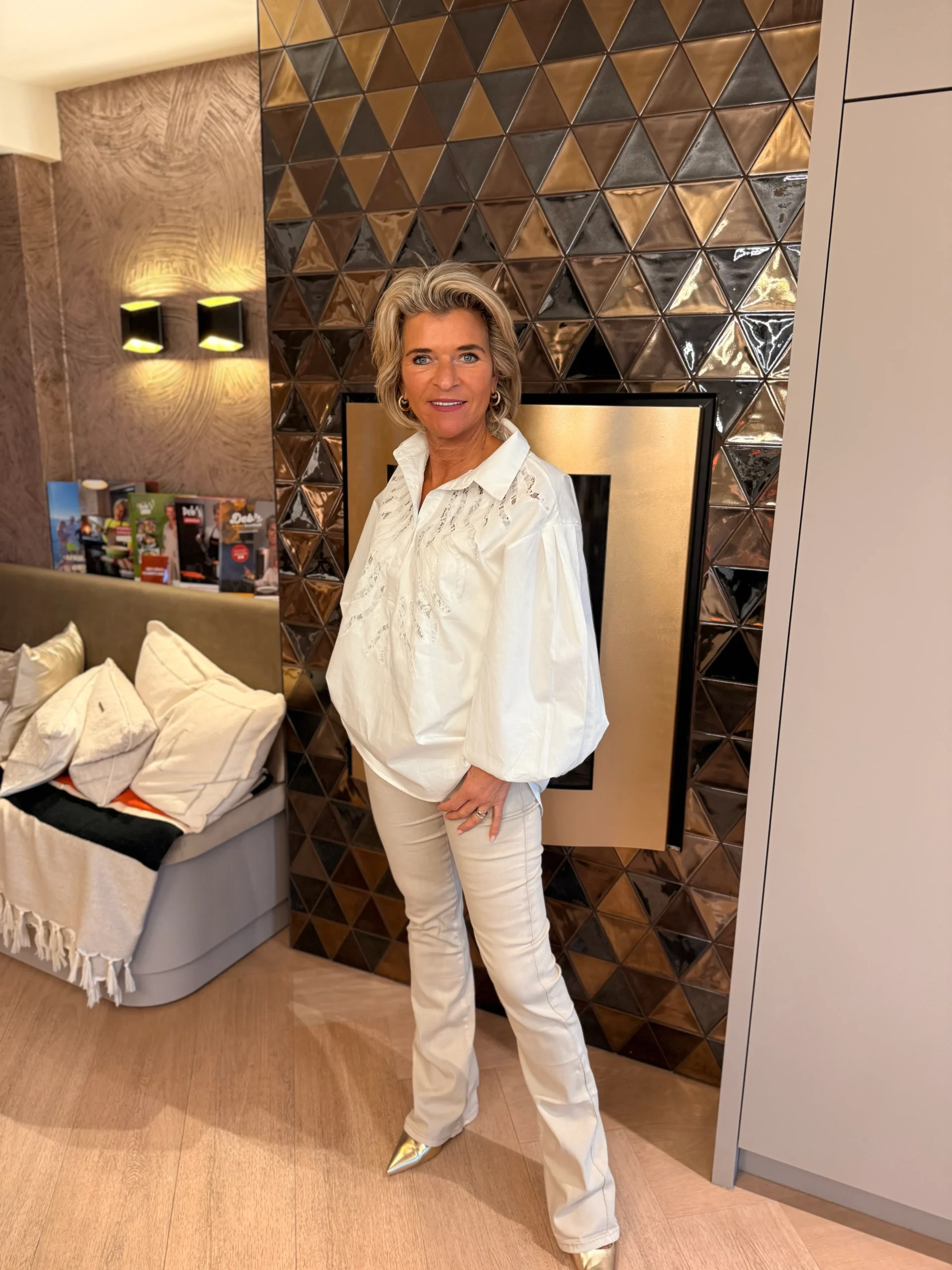 Deze wijdvallende blouse combineert comfort met stijlvolle details. De blouse heeft een ronde kraag en is achter langer, wat zorgt voor een elegant silhouet. De wijde mouwen zijn afgewerkt met elastiek bij de pols voor een subtiel ballon-effect. Op het voorpand is de blouse prachtig bewerkt met kant en hij kan halverwege geopend worden met knoopjes voor extra draagcomfort en veelzijdigheid. Perfect voor een chique of casual look.