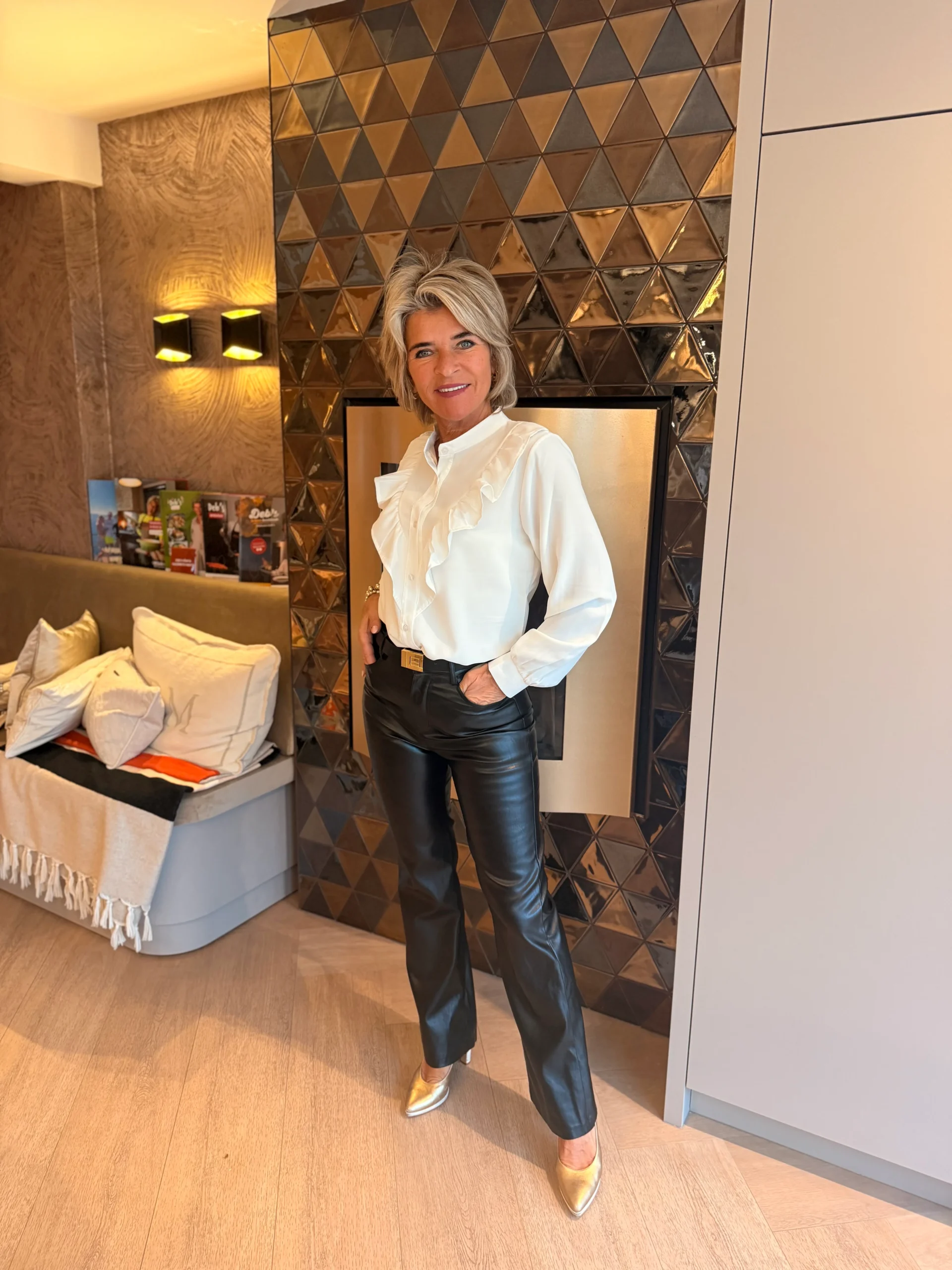 Een elegante, kreukvrije blouse met een verfijnd boordje langs de hals. Het voorpand heeft een V-insnijding afgewerkt met een mooie roezel. De mouwen eindigen in een smal boordje met een splitje, wat zorgt voor een vrouwelijke en subtiele afwerking. De blouse heeft een zachte, vloeiende uitstraling en blijft mooi glad gedurende de dag.