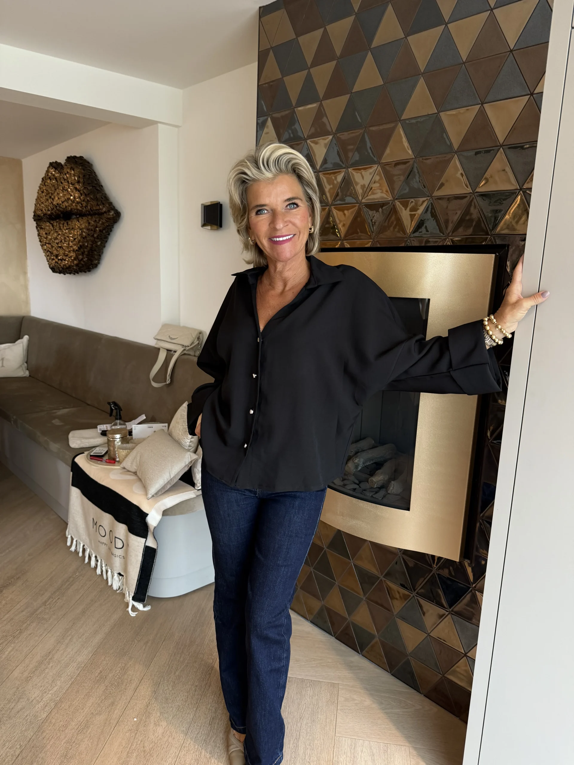 Deze elegante blouse is voorzien van een klassieke kraag en een subtiele witte knoopsluiting. Het tijdloze ontwerp maakt het een veelzijdig item voor zowel casual als zakelijke looks.