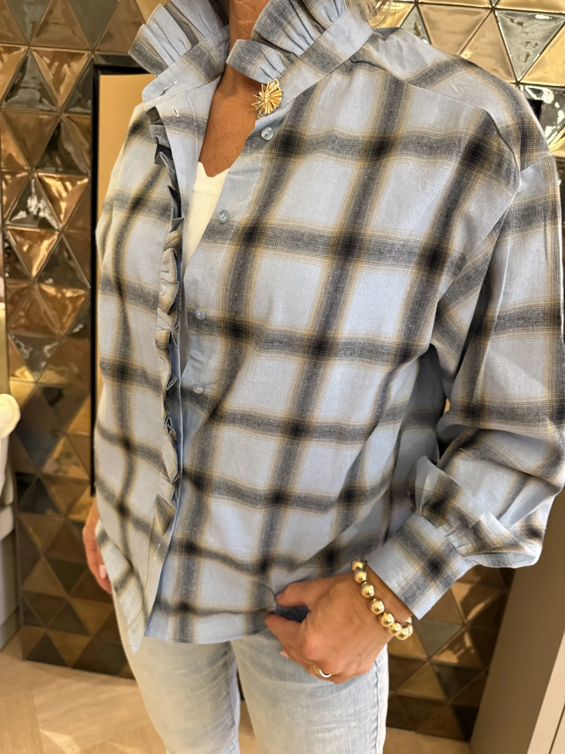 Deze elegante blouse is een stijlvolle toevoeging aan elke garderobe. De blouse is uitgevoerd in een verfijnd blokmotief, wat zorgt voor een moderne en tijdloze uitstraling. Het boordje is afgewerkt met een sierlijke roesel die de blouse een romantisch en verfijnd karakter geeft.