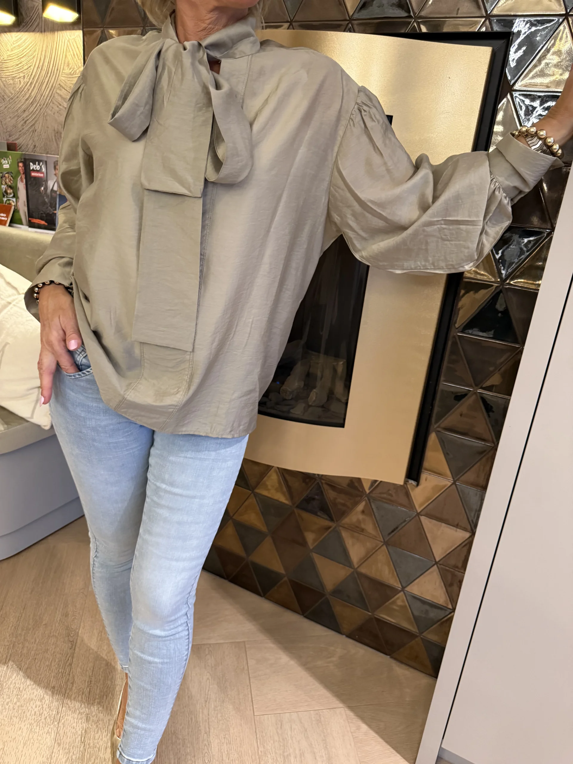 Deze blouse van luchtige voile stof met subtiele glans geeft je outfit direct een elegante uitstraling. De blouse sluit aan de voorzijde met een grote V-hals, wat zorgt voor een vrouwelijke en verfijnde look. Het boordje is afgewerkt met een brede strik en vormt een speels, stijlvol accent.