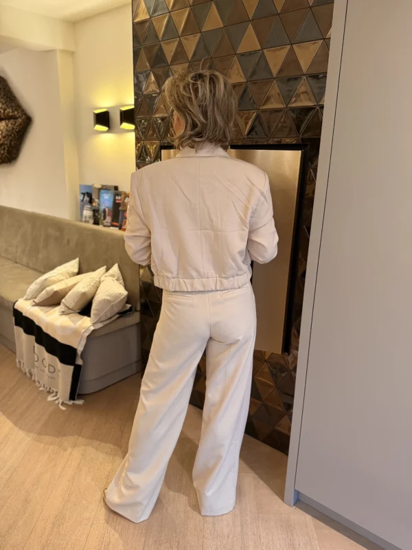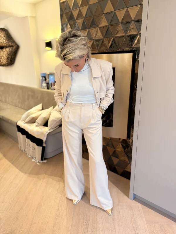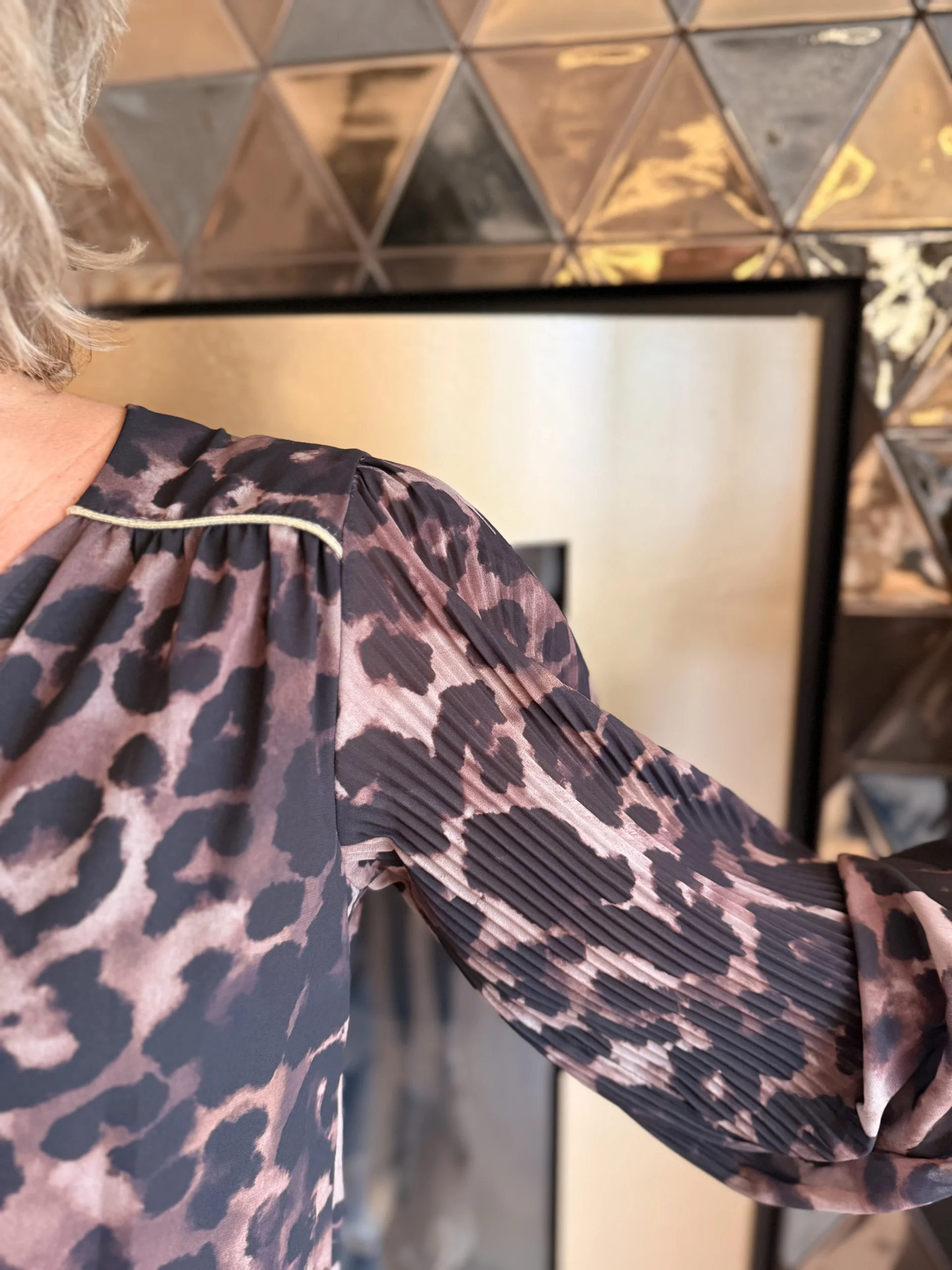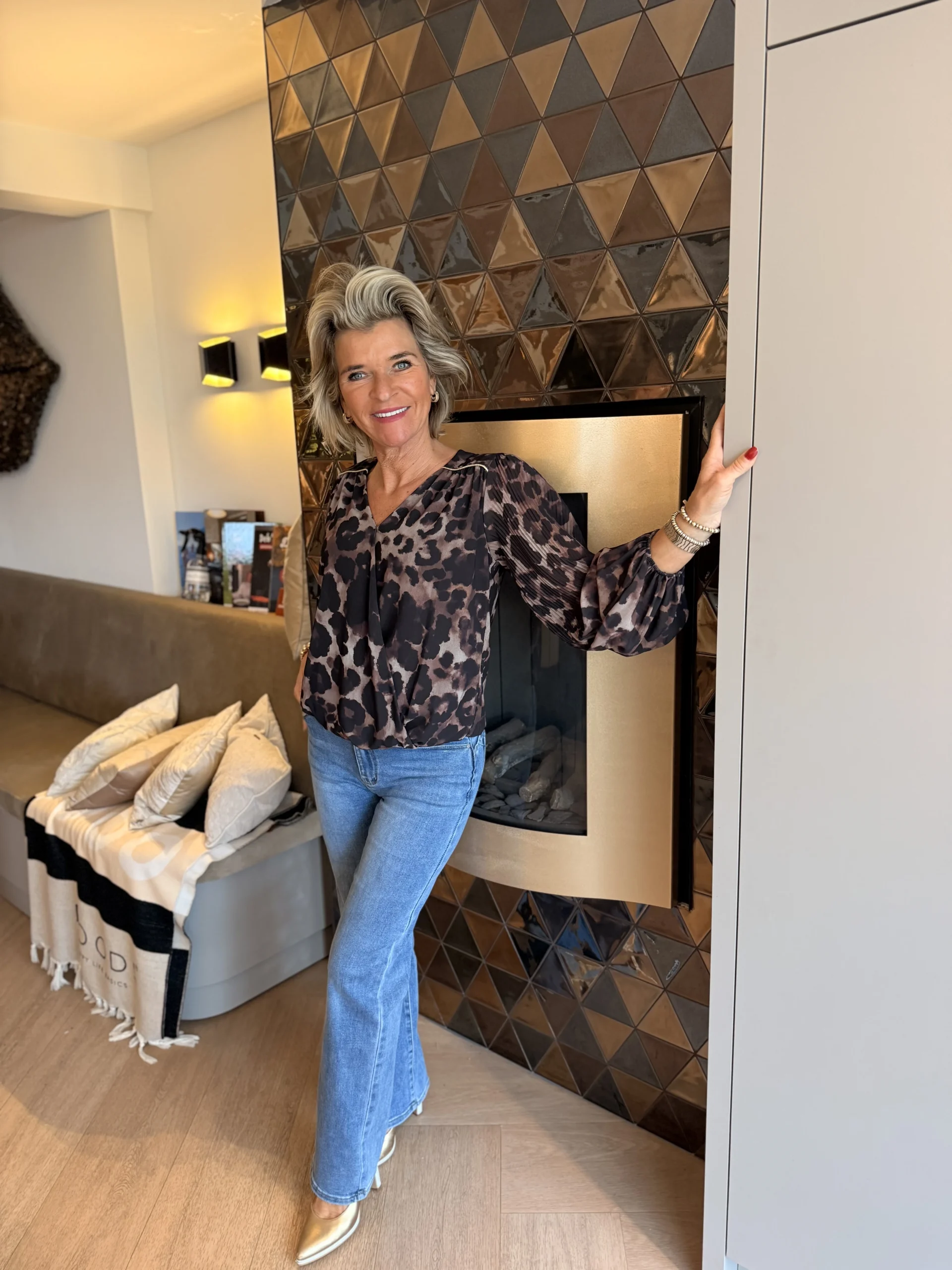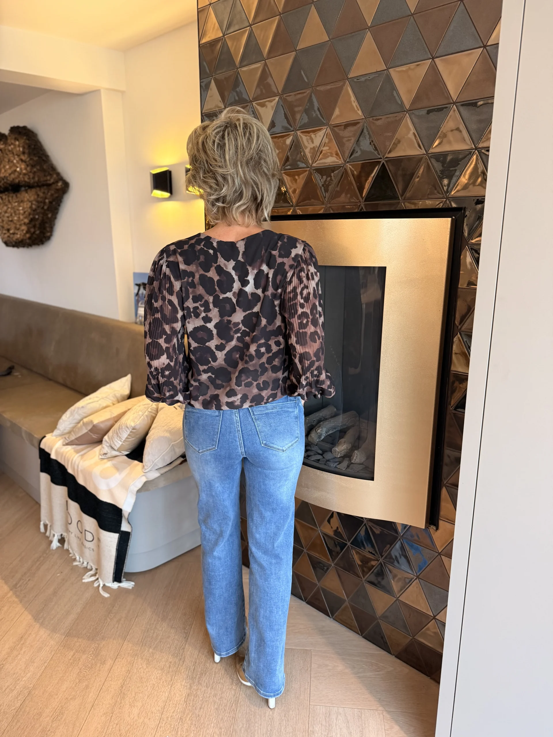 Deze elegante blouse is gemaakt van een lichte voile stof en heeft een vrouwelijke uitstraling dankzij de subtiele overslag aan de voorkant. De geplisseerde mouwen zorgen voor een sierlijk effect, terwijl het gouden randje over de schouders een chique touch toevoegt.