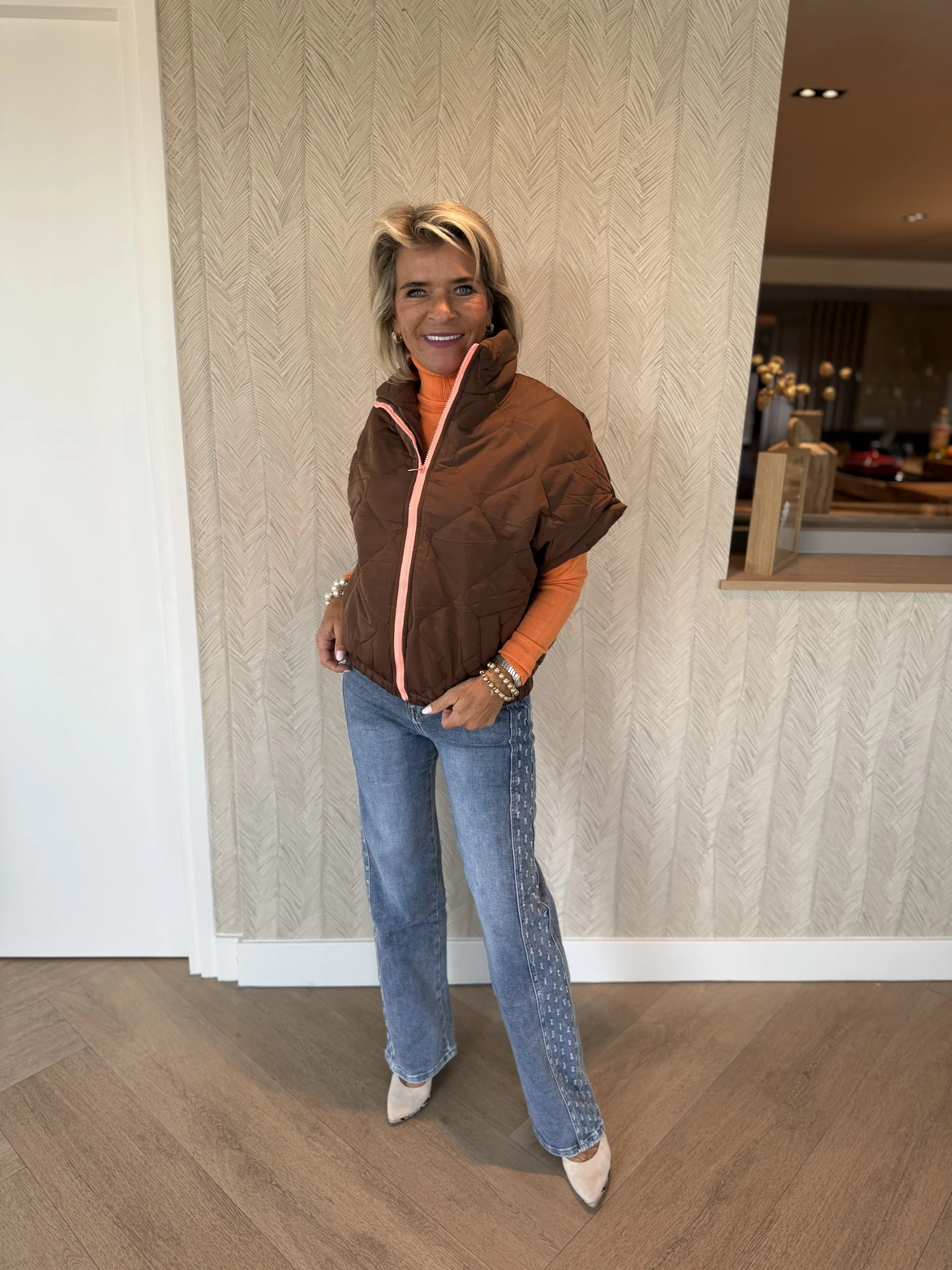 Deze modieuze bodywarmer in bruin springt eruit door de fluoriserende zalm rits. Het fijne stiksel zorgt voor een moderne en sportieve uitstraling, terwijl het opstaande boordje en de steekzakken zorgen voor comfort en gemak.