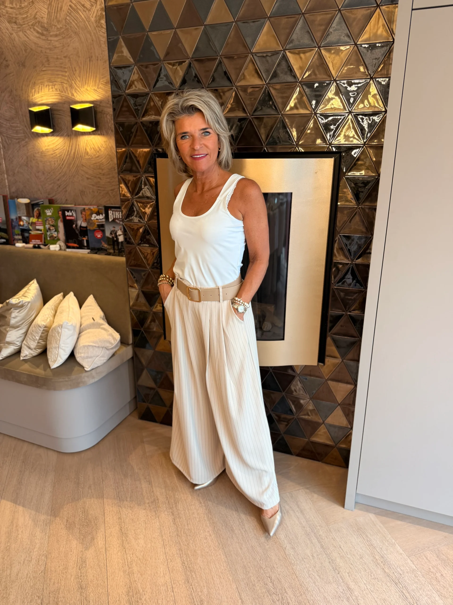 Met een binnenbeenlengte van 70 cm valt de broek elegant en is hij perfect te combineren voor zowel een casual als een meer geklede look.