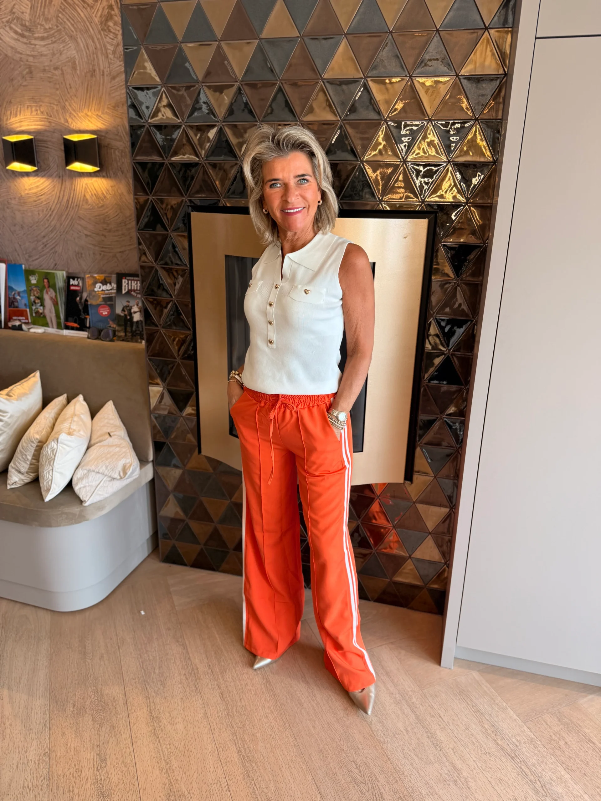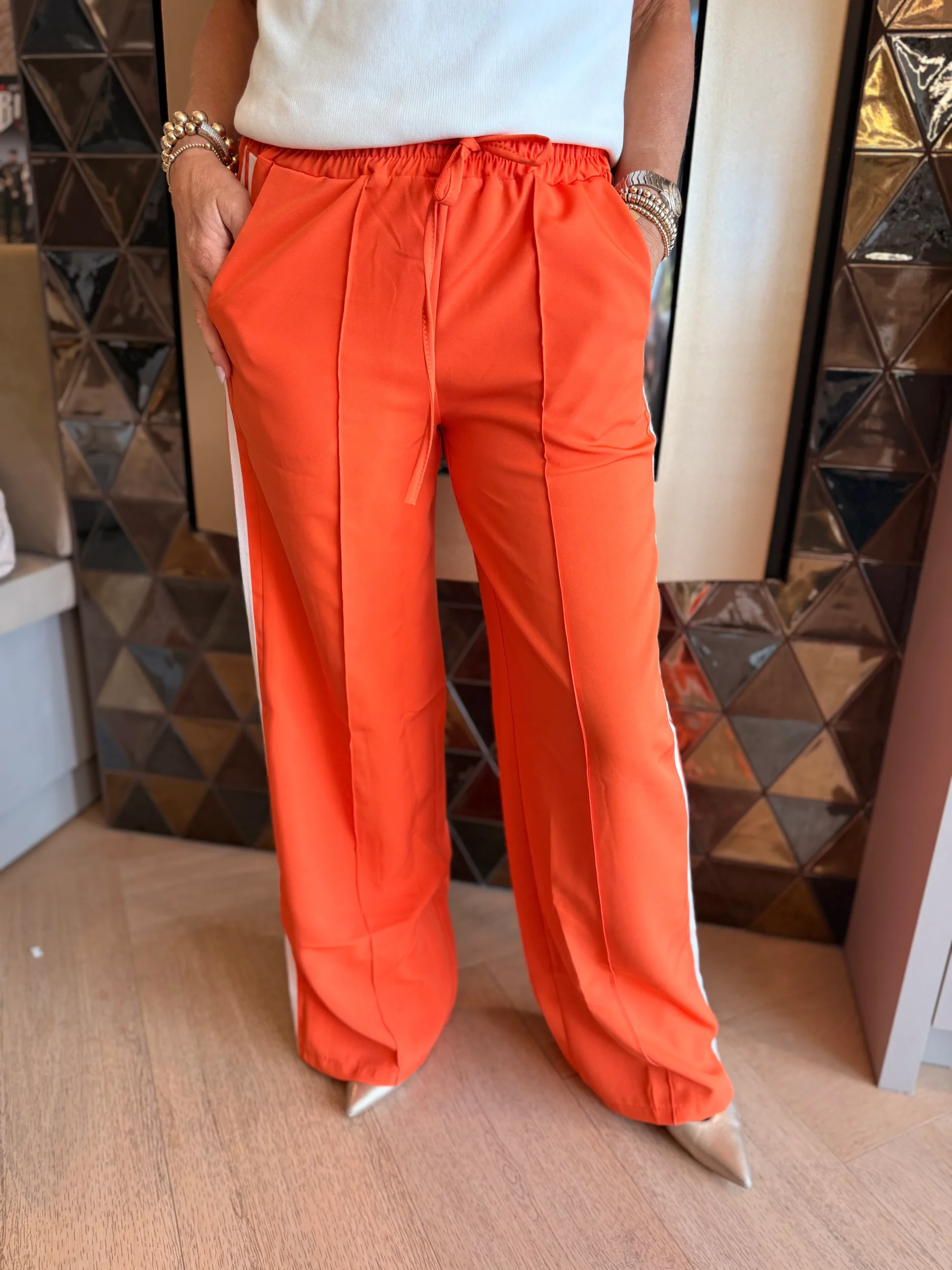 De twee witte strepen langs de zijkant geven de broek een sportieve en trendy uitstraling. Ideaal voor een casual look én extra leuk voor Koningsdag!