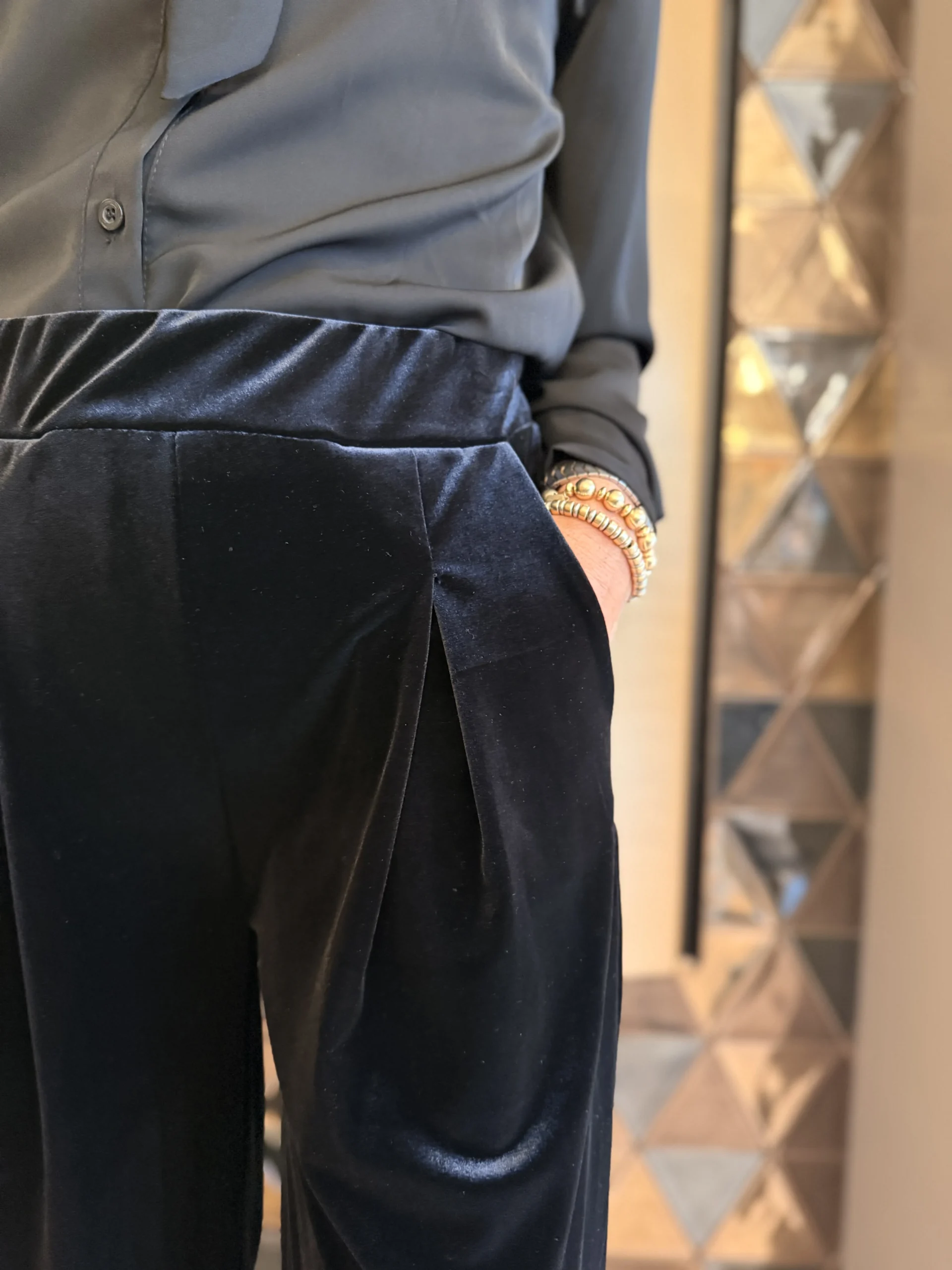 Comfort en klasse komen samen in deze prachtige velours broek. De zachte, glanzende stof voelt luxe aan en zorgt voor een stijlvolle uitstraling. De broek heeft een elastische tailleband voor extra draagcomfort en is voorzien van voorsteekzakken en twee plooien aan de voorkant, wat zorgt voor een mooie, flatterende pasvorm.