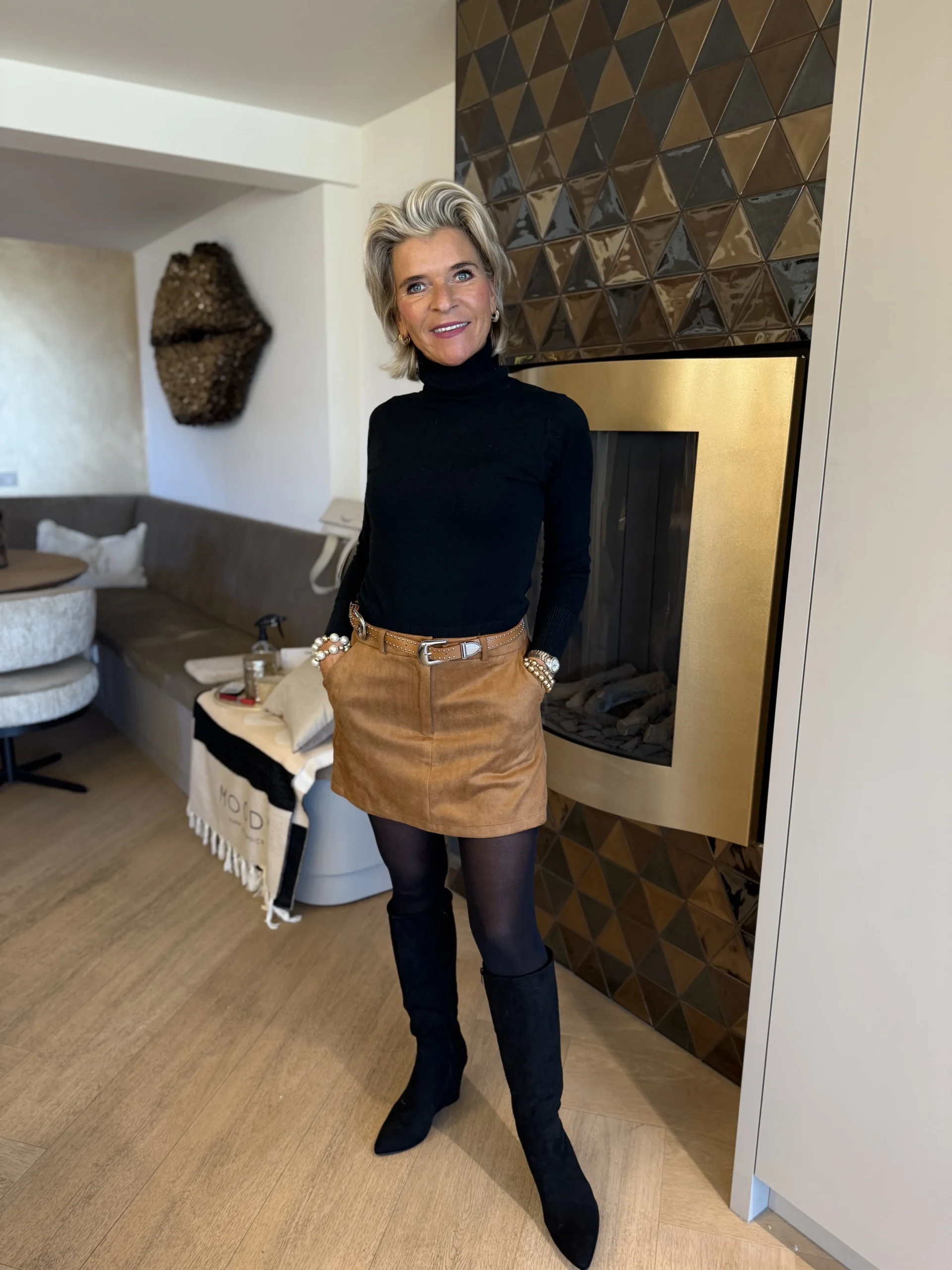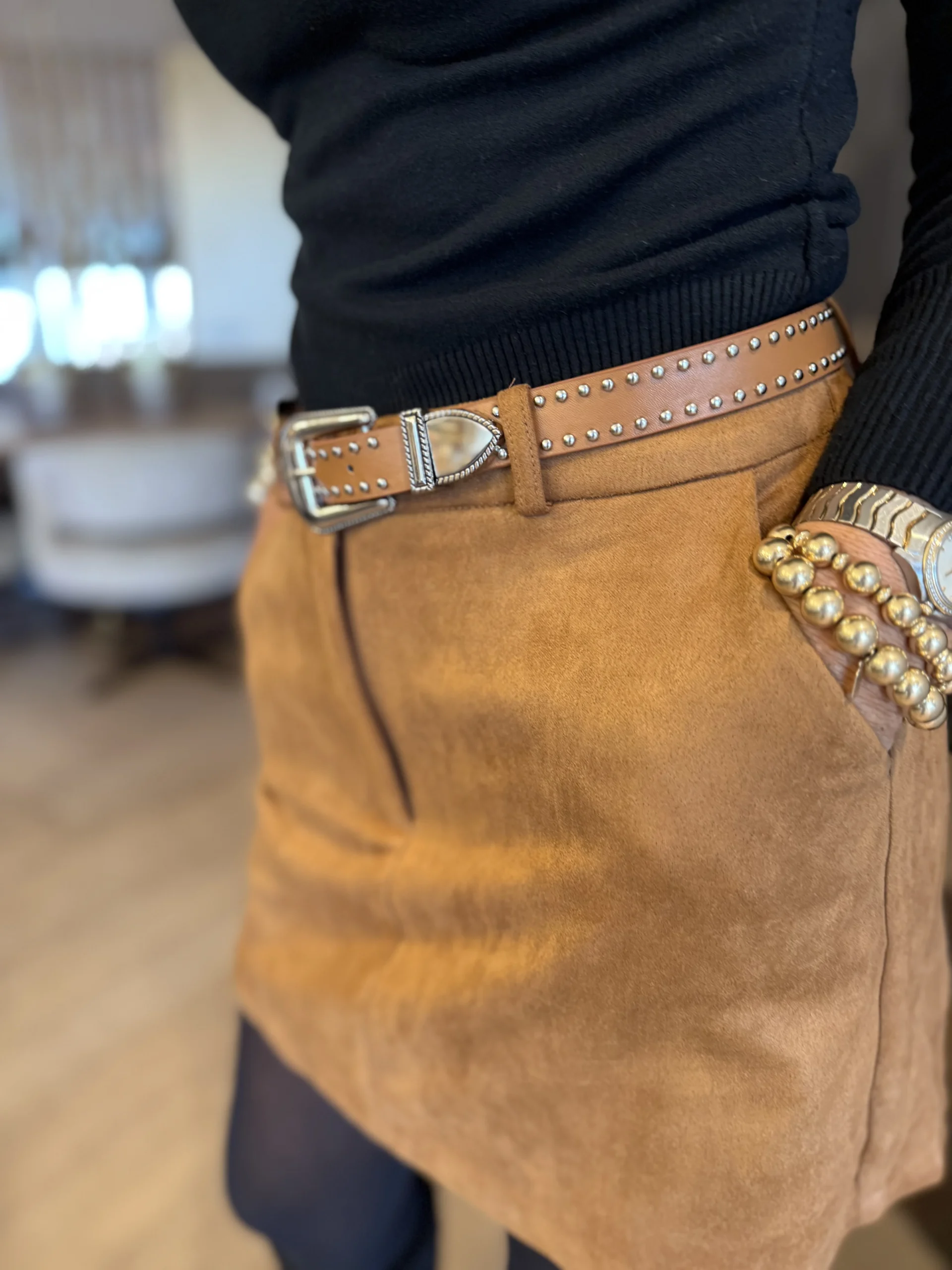 Trendy broekrok van zachte suedine, voorzien van handige steekzakken. Afgewerkt met een stijlvol riempje met studs voor een speelse en stoere touch. Een comfortabel en modieus item dat perfect te combineren is voor zowel casual als chic.