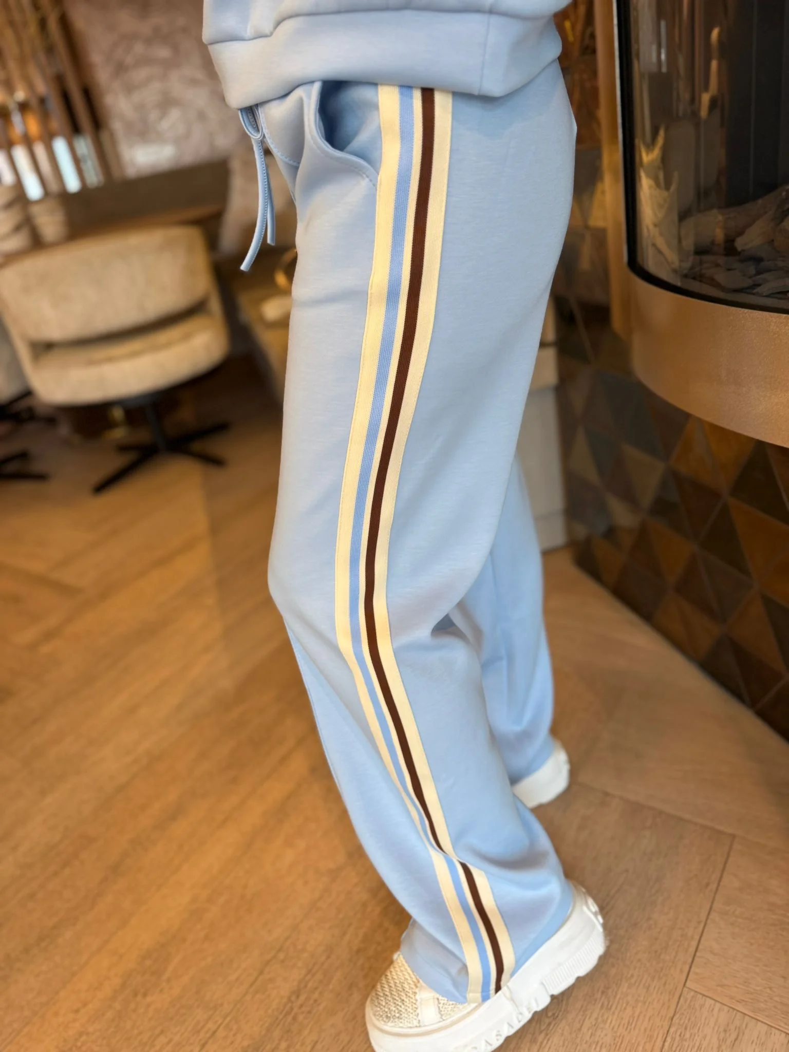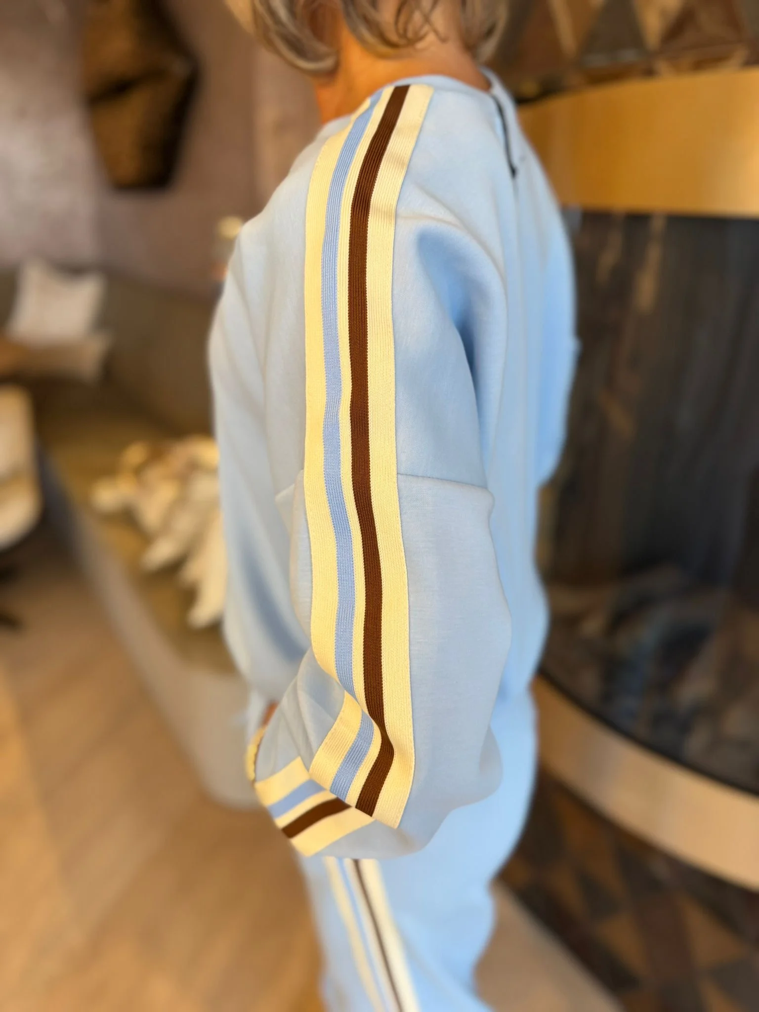 Een heerlijk comfortabel comfypak bestaande uit een broek en een sweater. De sweater heeft een ronde hals en langs de mouwen loopt een stijlvolle bies. Onderaan de mouwen zit een boordje voor een mooie en comfortabele pasvorm.