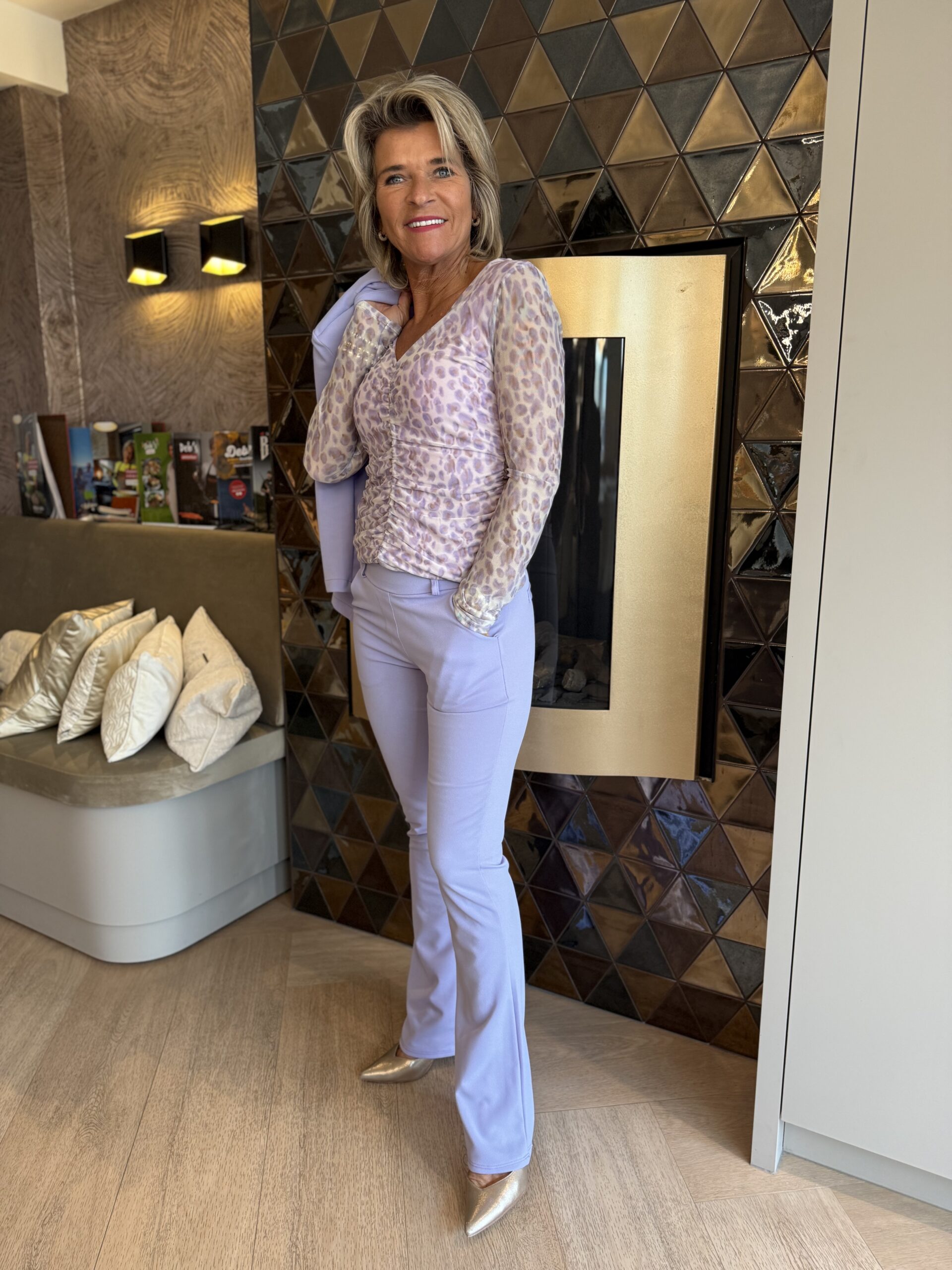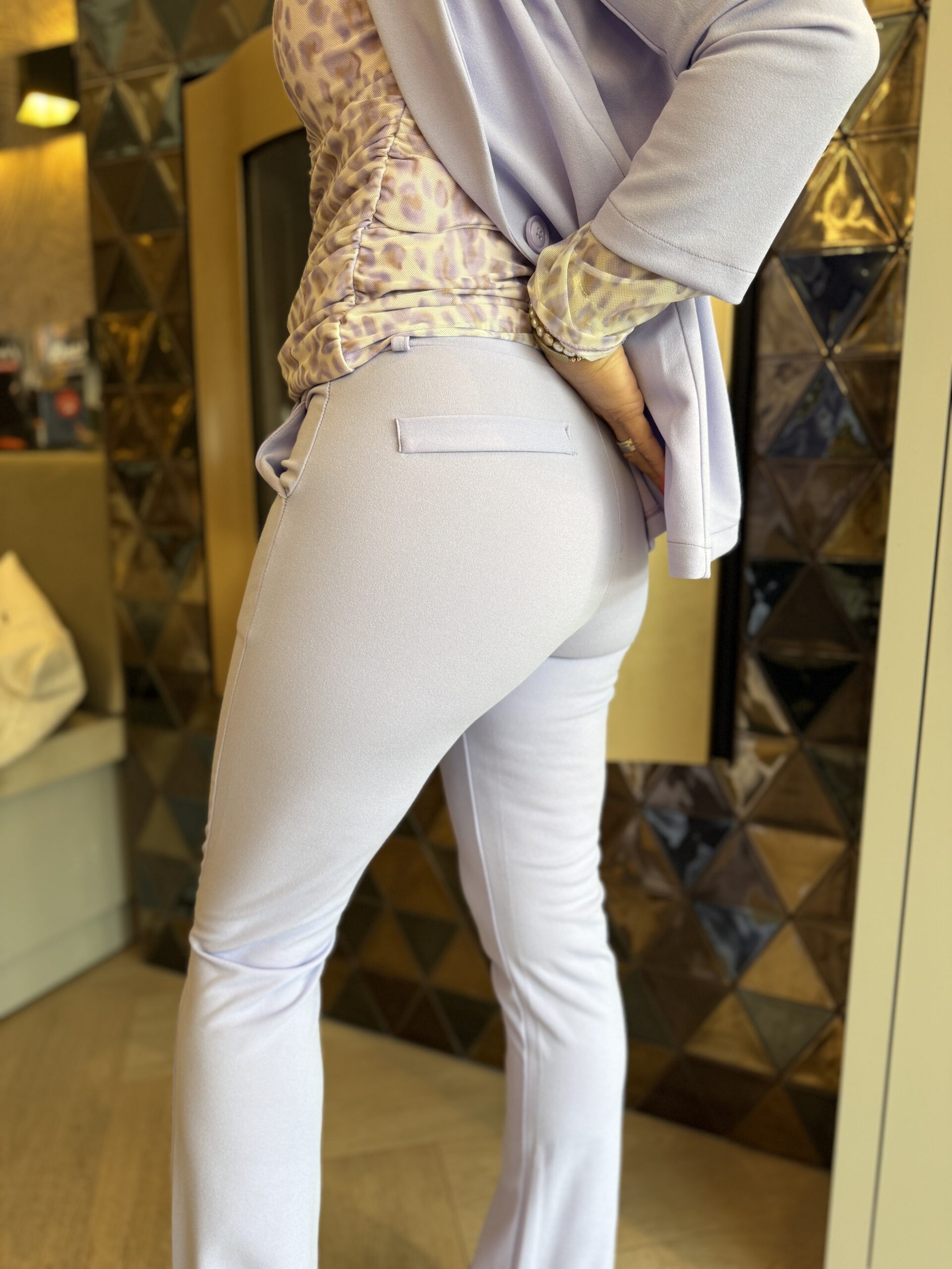 - Deze stijlvolle flared broek heeft een aansluitende pasvorm met een elegante uitlopende pijp. De broek is voorzien van een tailleband met riemlussen en twee zakken. Aan de achterkant zitten twee sierzakken voor een verfijnde look. Perfectte combineren met de bijpassende blazer.