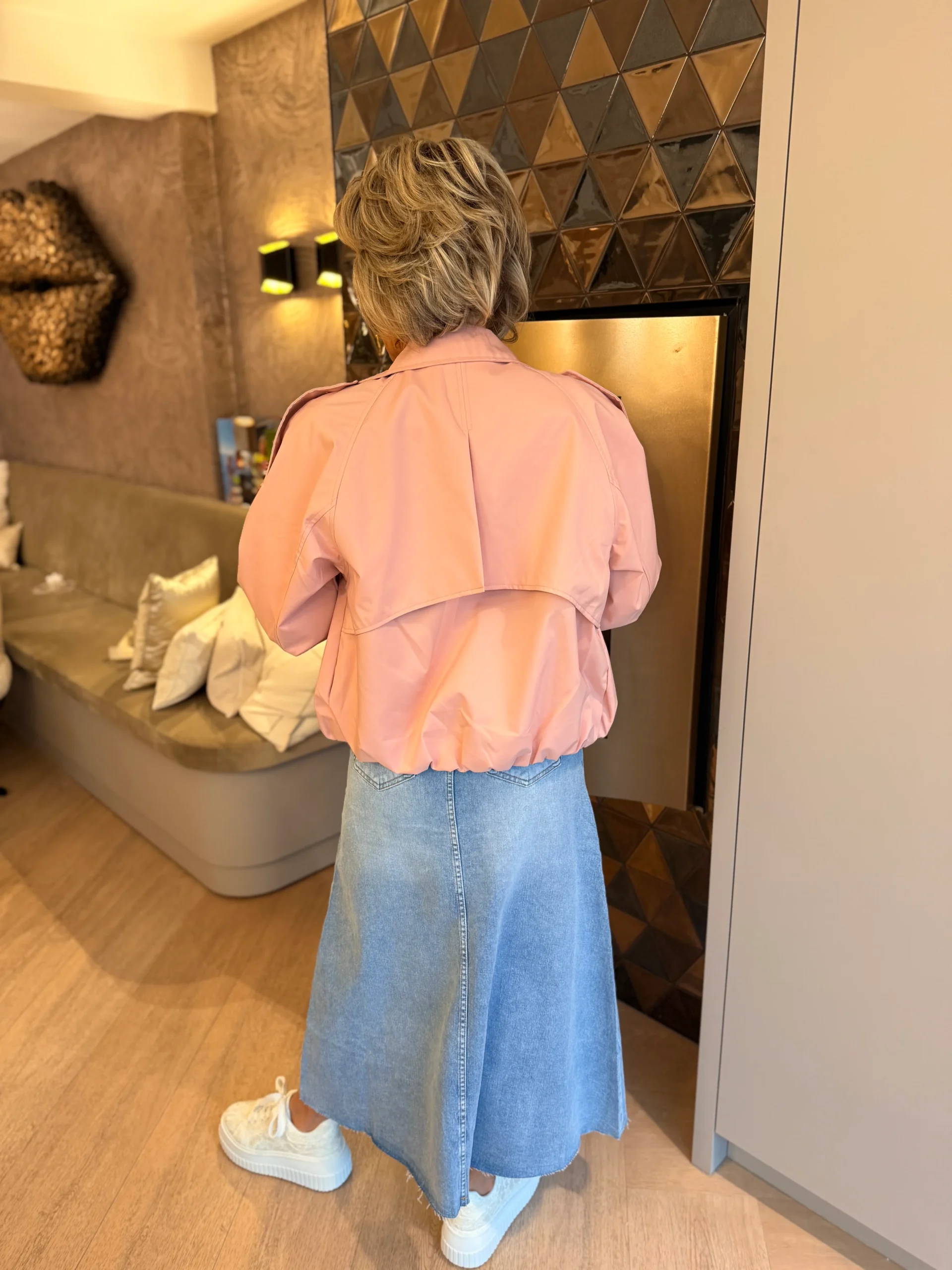 Deze modieuze jas met brede reverskraag geeft je outfit direct een stijlvolle upgrade. Aan de voorkant is de jas afgewerkt met paspelzakken en een speelse klep met knoopdetail op één zijde. Het voorpand sluit met twee knopen en aan de onderkant zorgt het elastiek voor een trendy balloneffect. De banden met knoop op de schouders en onderaan geven de jas een stoer en eigentijds accent. Perfect voor een moderne, fashionable look!