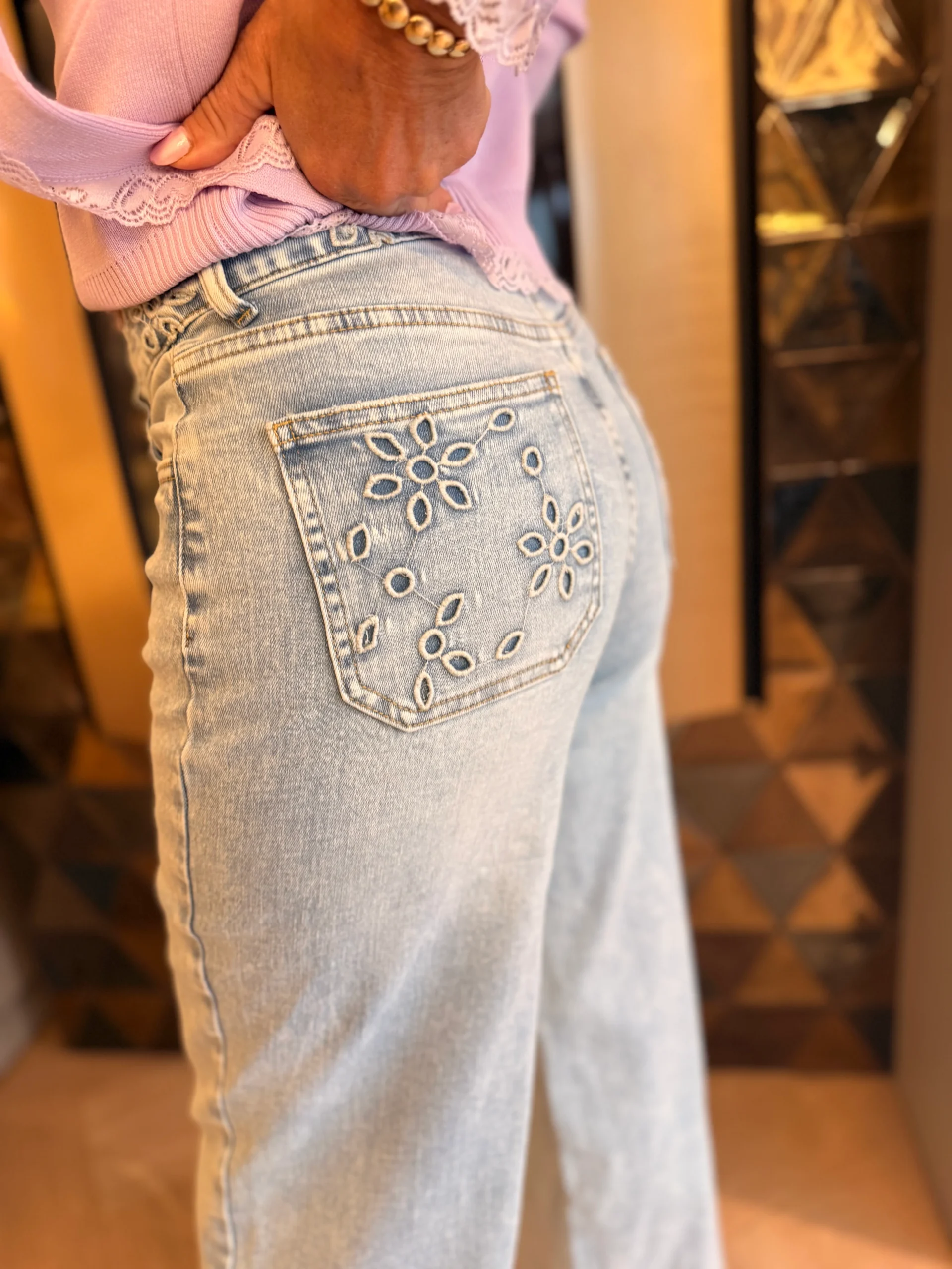 Deze jeans met lichte wassing heeft een frisse en stijlvolle uitstraling. Het model is voorzien van steekzakken aan de voorzijde en opvallende, grote vierkante achterzakken. Zowel de achterzakken als de boord zijn afgewerkt met een prachtig detail van opengewerkte accenten, wat de jeans een unieke en verfijnde look geeft.