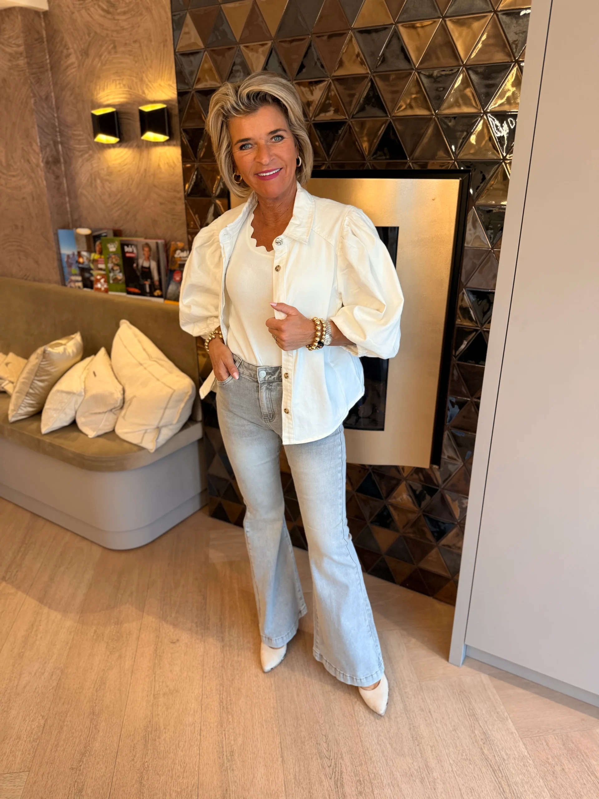 Flair broek met een elegante uitlopende pijp en mooie achterzakken die de pasvorm flatteren. Comfortabel en stijlvol, perfect voor zowel casual als geklede outfits.