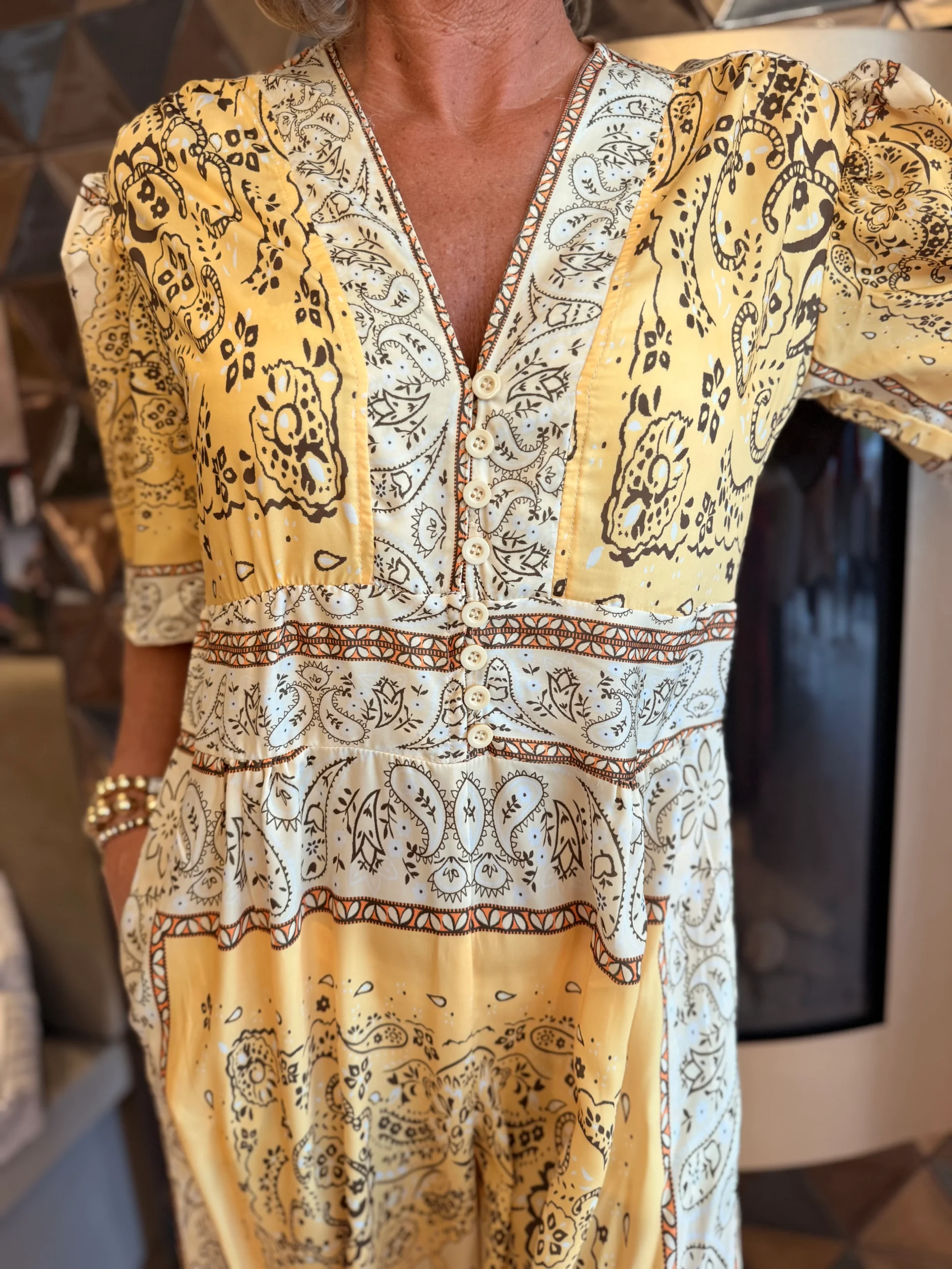 Deze jumpsuit is een echte must-have voor een moeiteloos stijlvolle look. De speelse print in combinatie met de korte mouwen en de elegante V-hals zorgt voor een vrouwelijke uitstraling. Aan de voorzijde loopt een rij van acht kleine knoopjes tot het midden, wat de jumpsuit een verfijnd detail geeft.