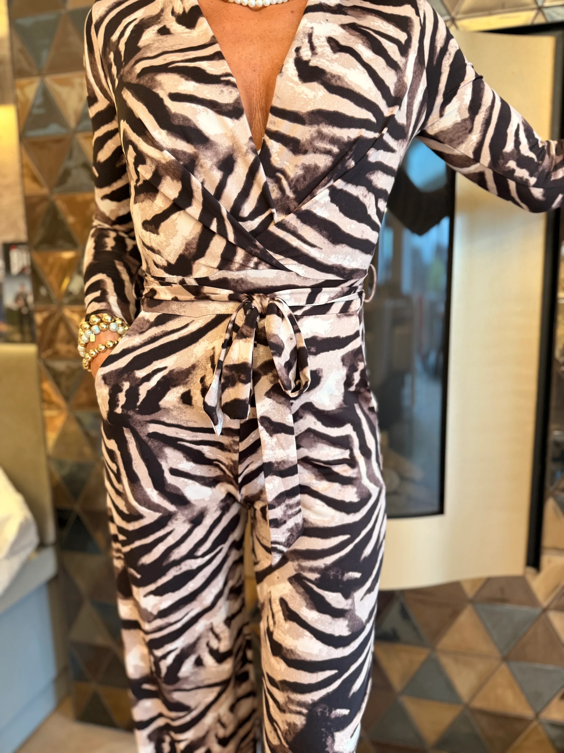 De bovenkant loopt in een V-hals en valt mooi over elkaar, terwijl de band van dezelfde stof in het midden het geheel samenbindt en je de jumpsuit naar wens kunt strikken voor een flatterende look. Binnenbeenlengte 82 cm