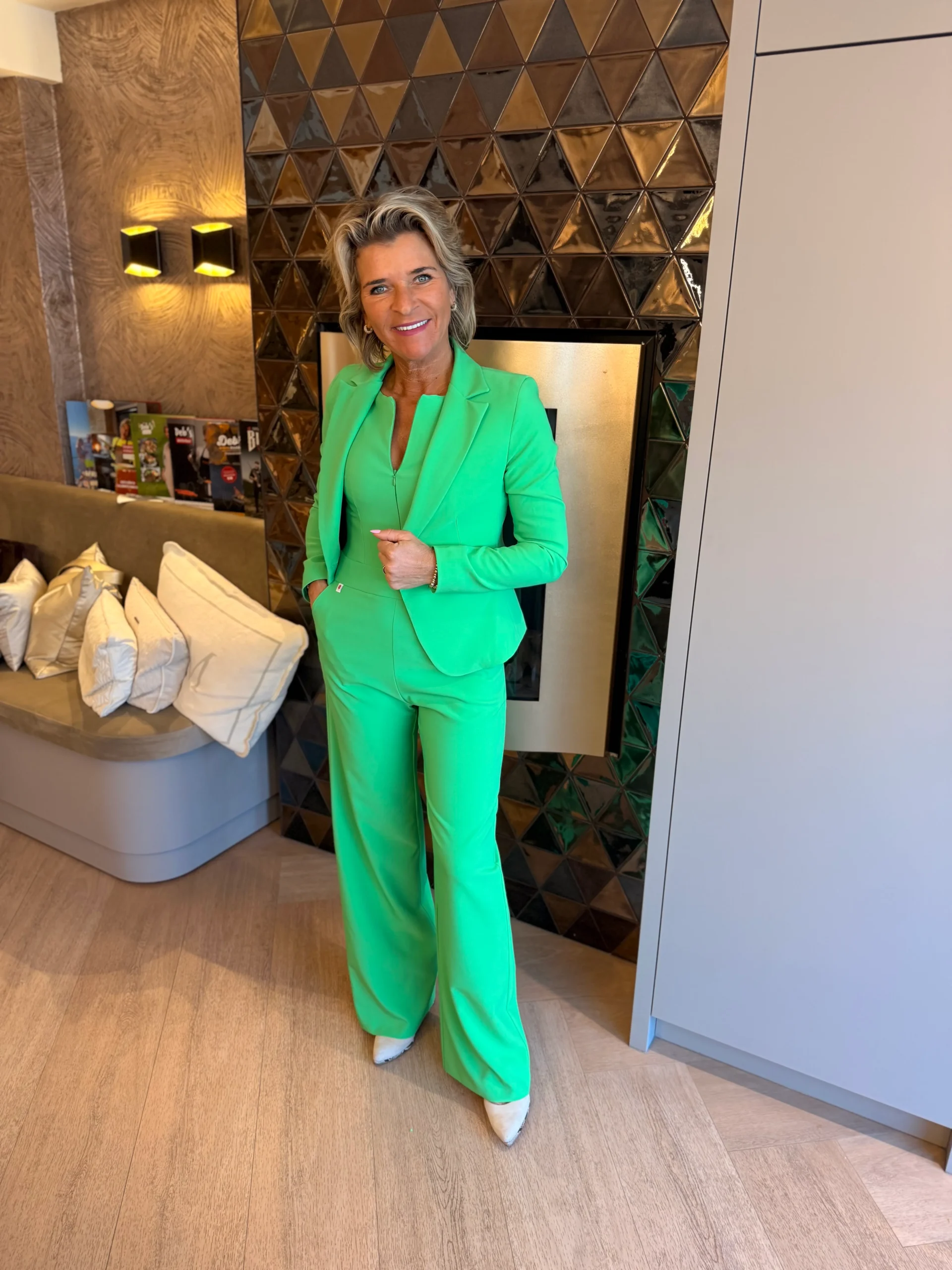 Voor een complete en stijlvolle look is er een bijpassende blazer verkrijgbaar, perfect om de jumpsuit zowel casual als chic te dragen.