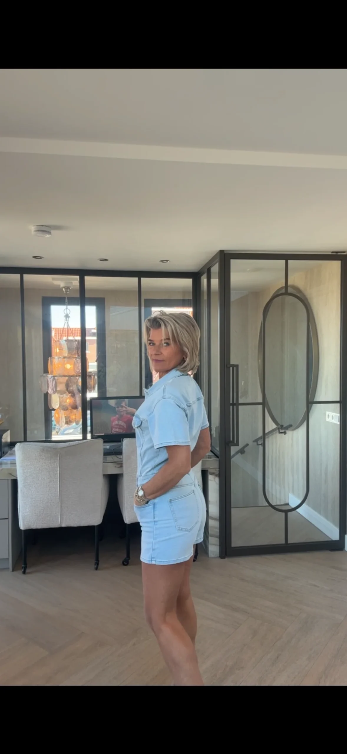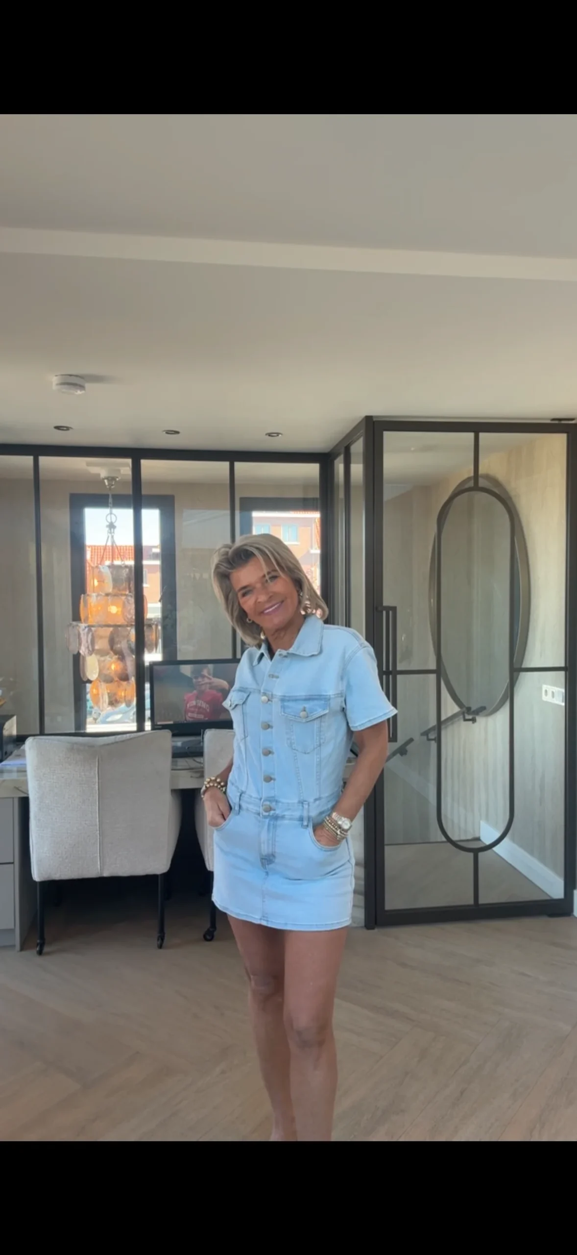 Jumpsuit van denim met korte mouwen en een kraag met knoopsluiting. Op het voorpand zitten zakken met kleppen, wat zorgt voor een stoere uitstraling. Aan de onderzijde lijkt het model op een rokje, maar is voorzien van een broekje eronder voor extra comfort en bewegingsvrijheid. Op de achterkant zitten zakken.
