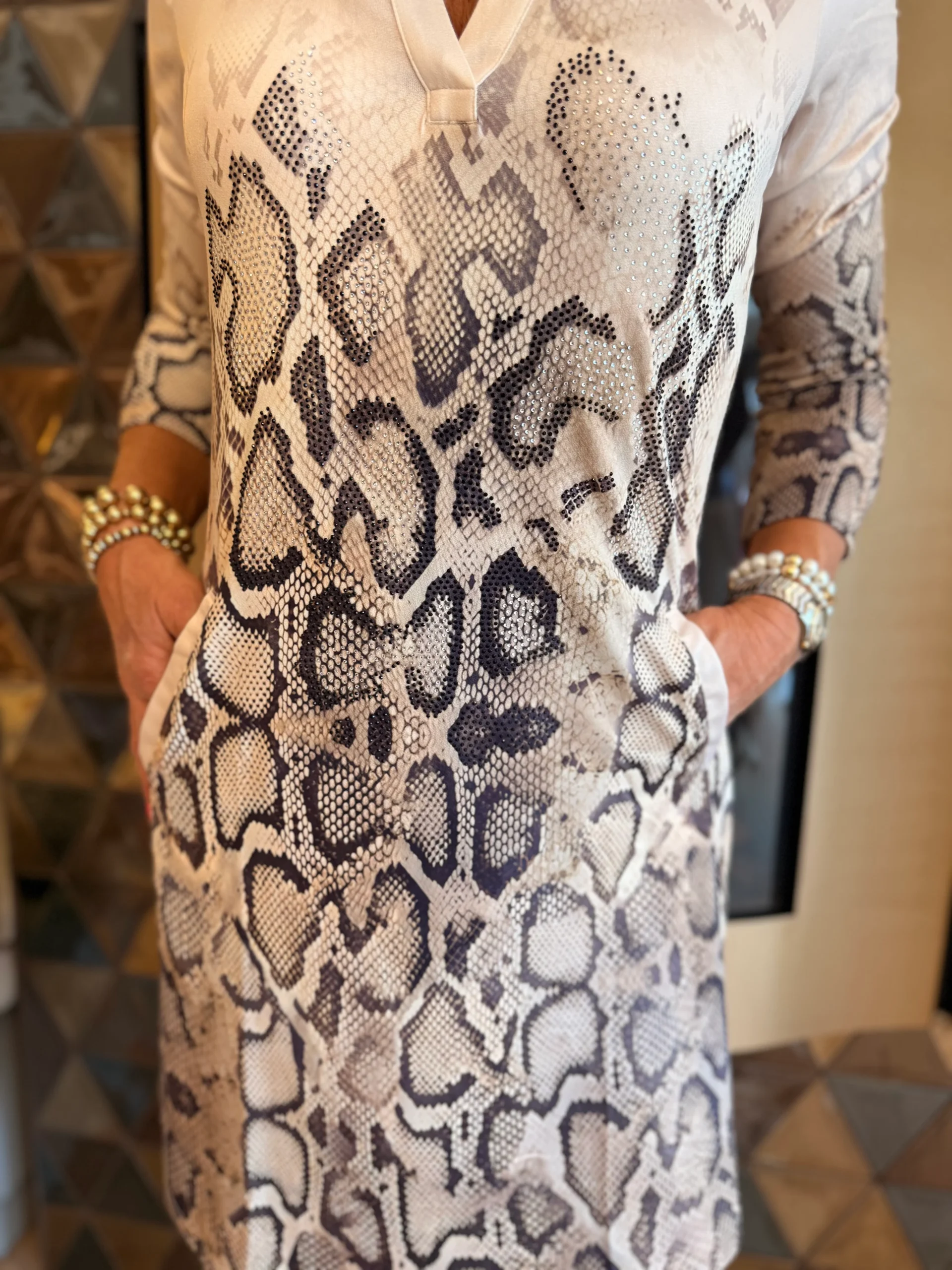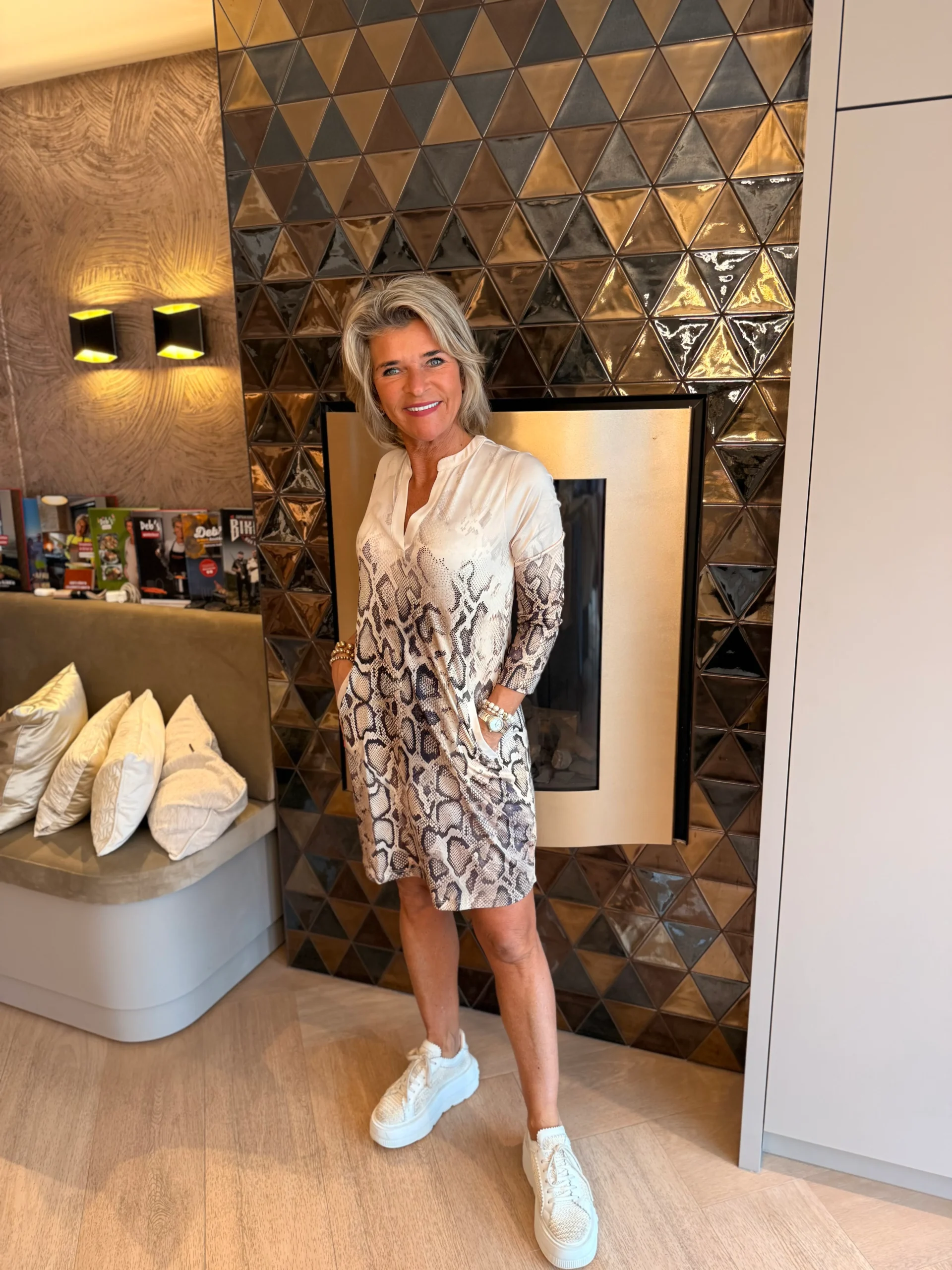 De jurk heeft lange mouwen en op het voorpand zijn paspelzakken verwerkt, wat zorgt voor een nette en moderne afwerking. Een veelzijdige jurk die zowel casual als wat chiquer te dragen is.