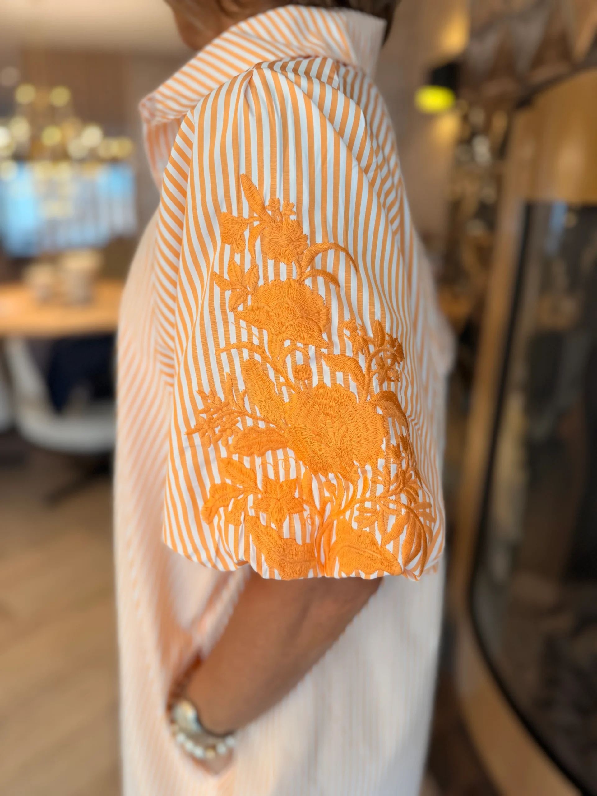 De jurk valt tot halverwege de kuit en draagt heerlijk luchtig. De korte, wijde mouwen zijn afgewerkt met een mooi borduursel, wat zorgt voor een speels en vrouwelijk detail.