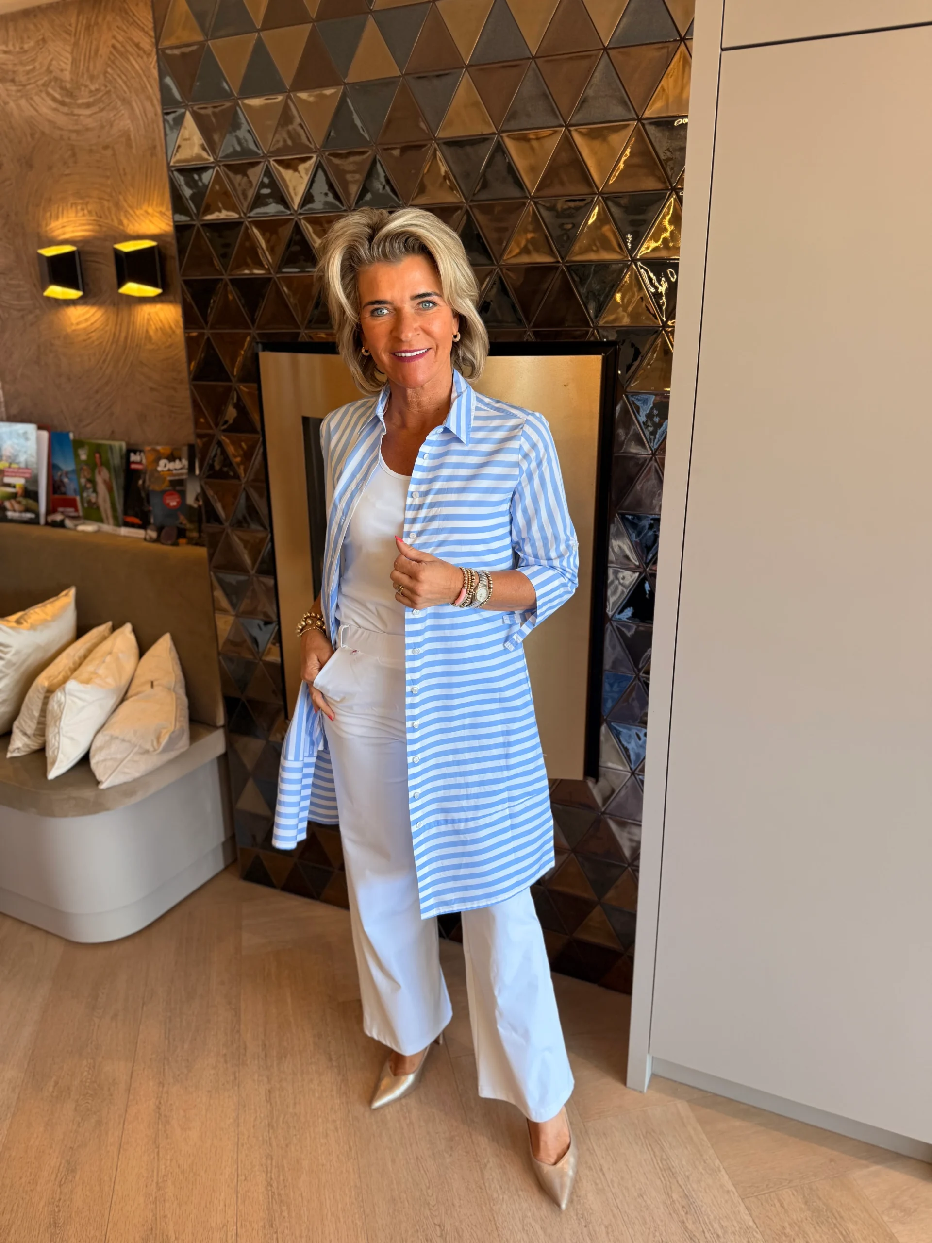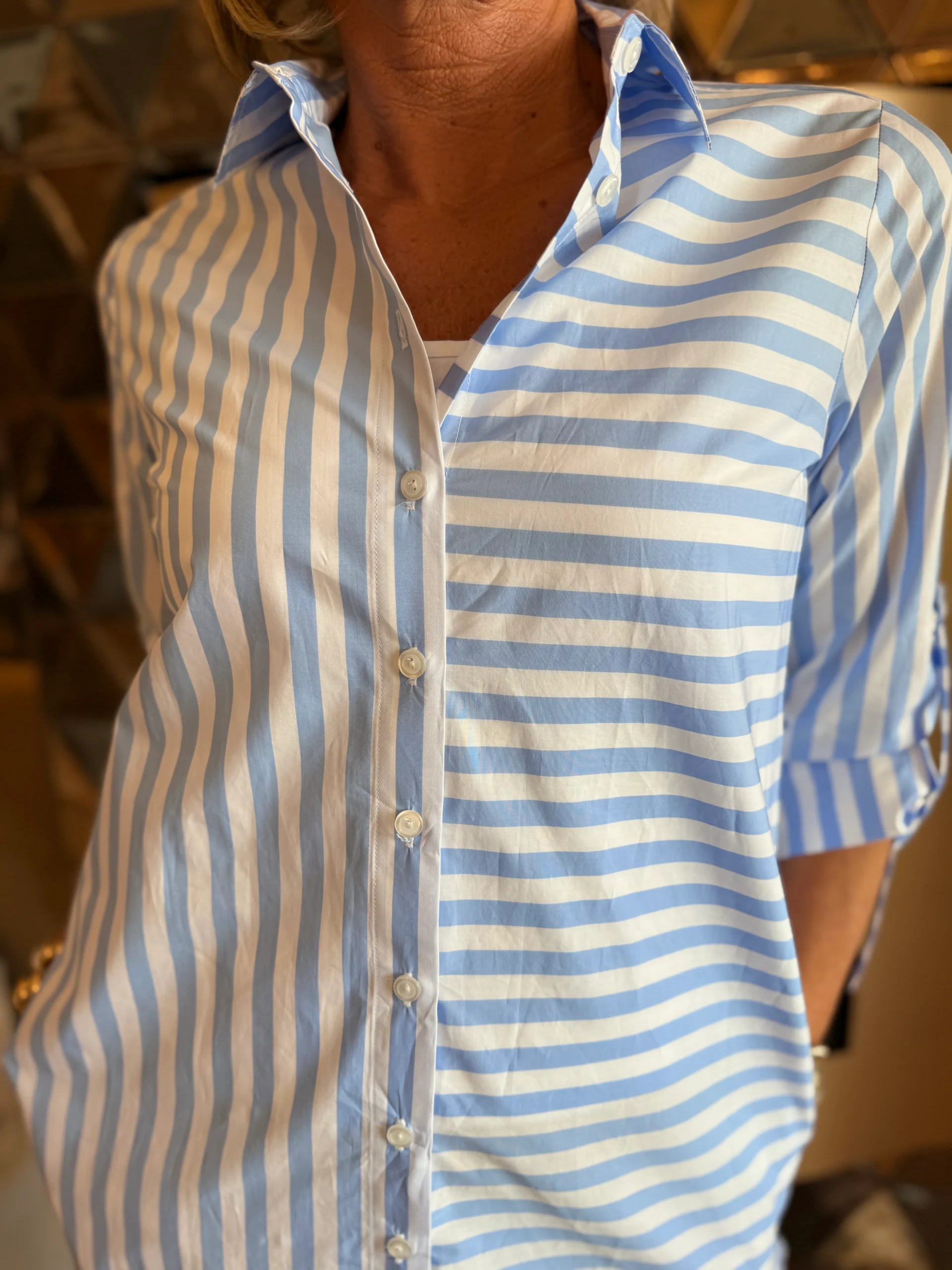 Deze jurk met kraag en knoopsluiting tot aan de brede onderboord straalt een speelse en stijlvolle elegantie uit. De gestreepte stof is op verschillende manieren verwerkt in het ontwerp, wat zorgt voor een verrassend en dynamisch effect.