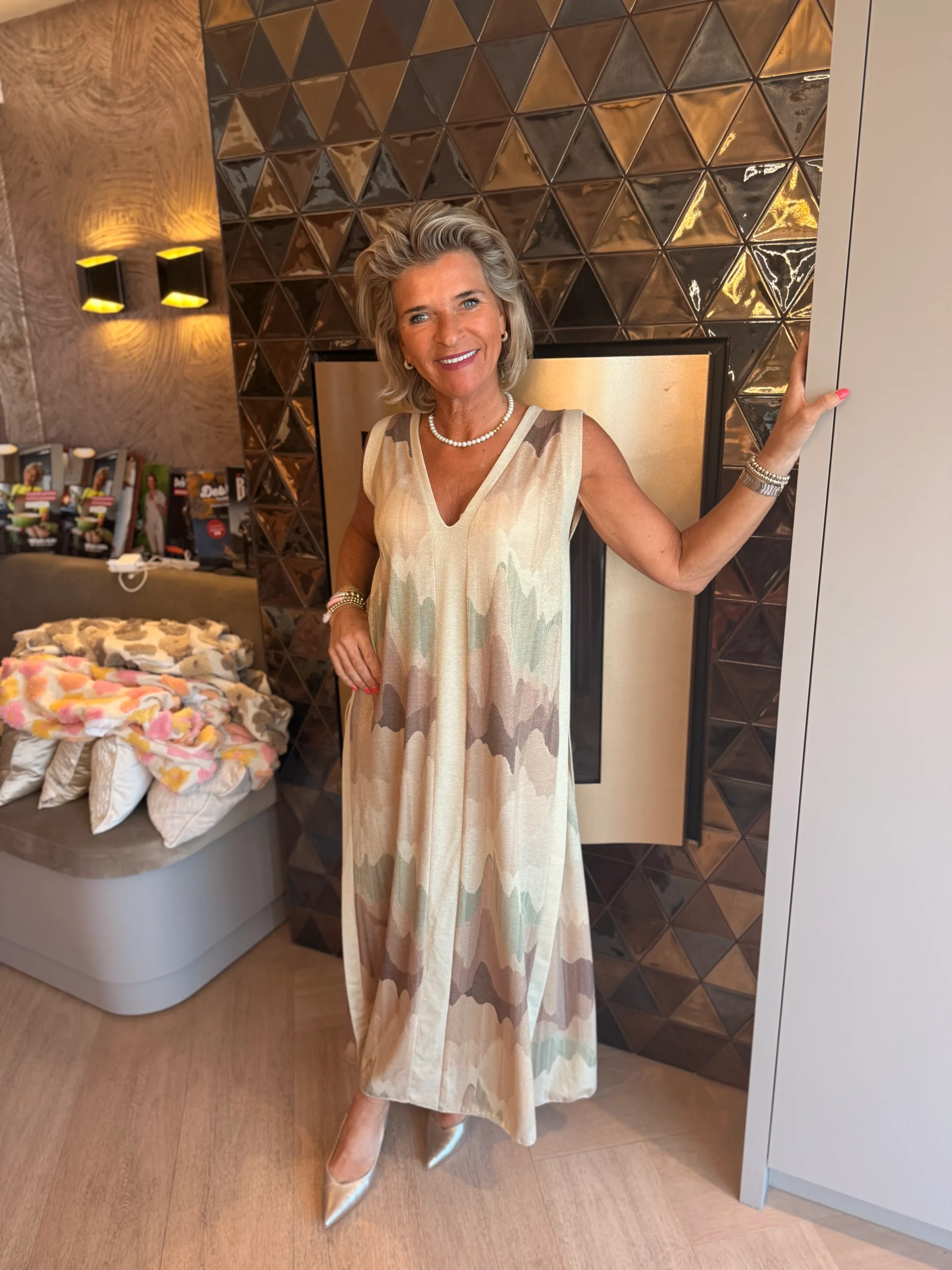Deze lange jurk is uitgevoerd in verschillende kleuren en heeft een subtiele gouden draad die zorgt voor een elegante glans.