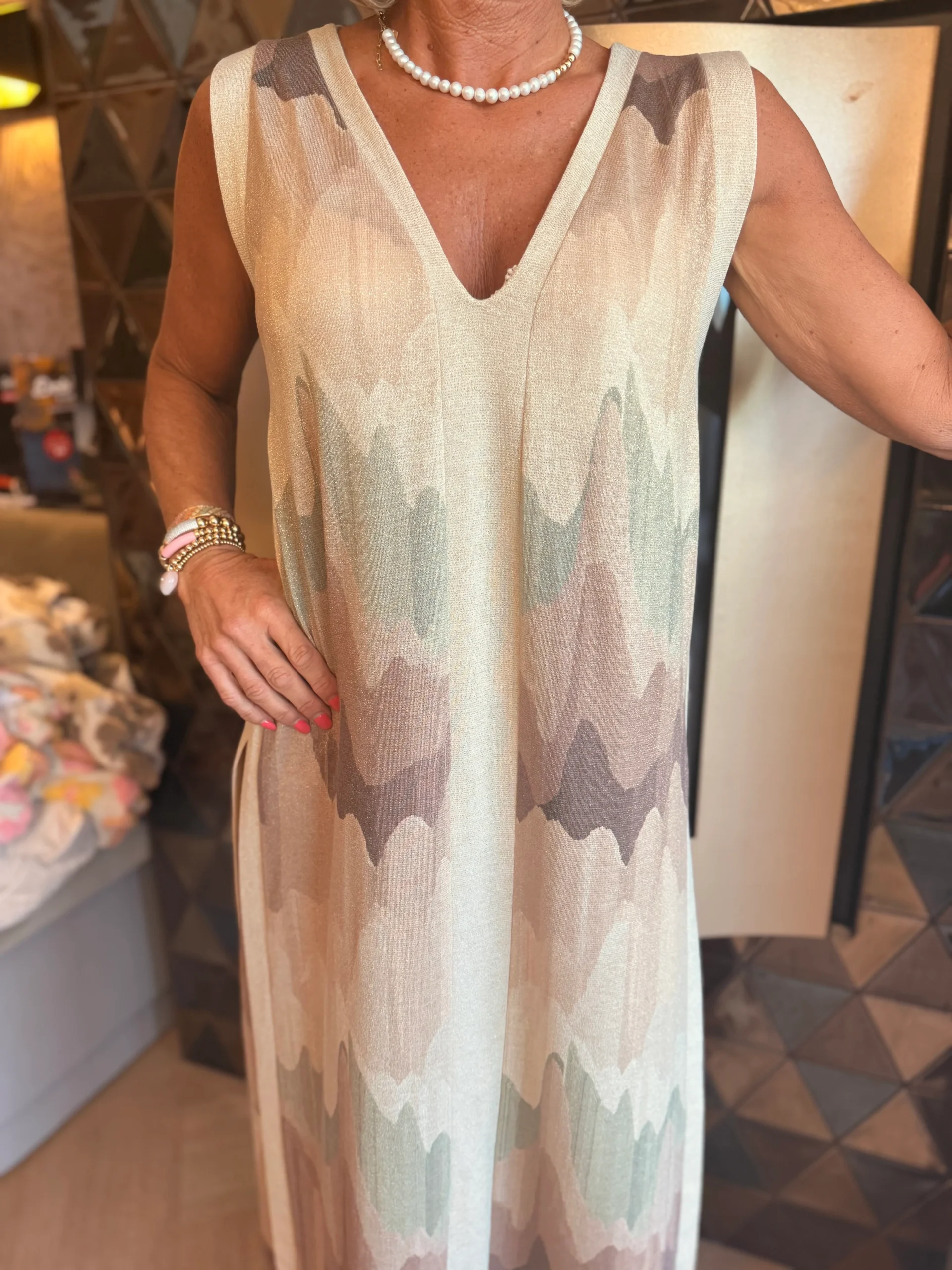 De jurk heeft een V-hals aan zowel de voor- als achterkant, afgewerkt met een brede beige bies die doorloopt tot onderaan de jurk. Deze bies loopt ook langs de zijkanten.
