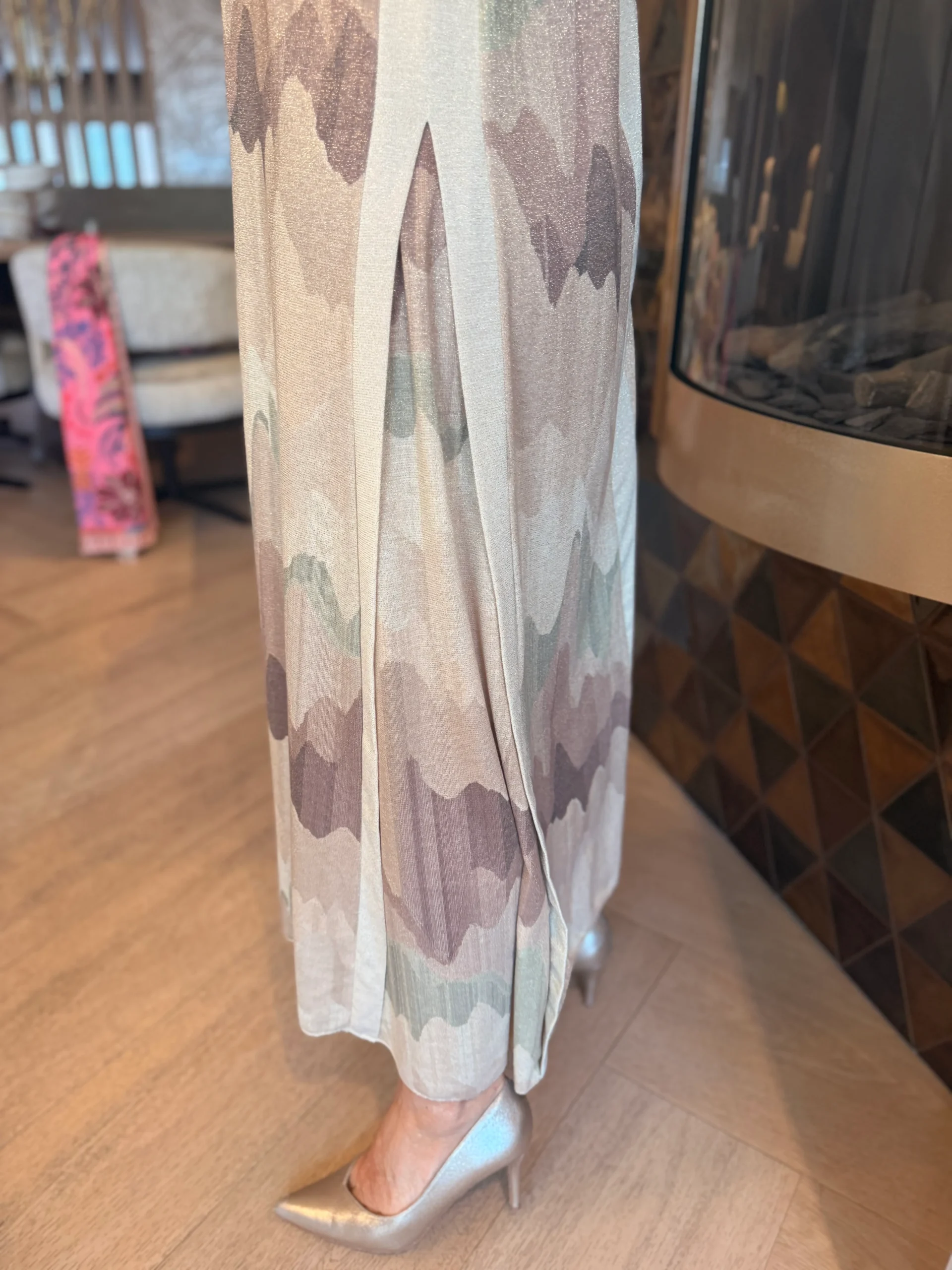 Vanaf de heup valt de beige bies open, waardoor de onderliggende stof van de jurk weer zichtbaar wordt. Dit geeft een speels en stijlvol effect.