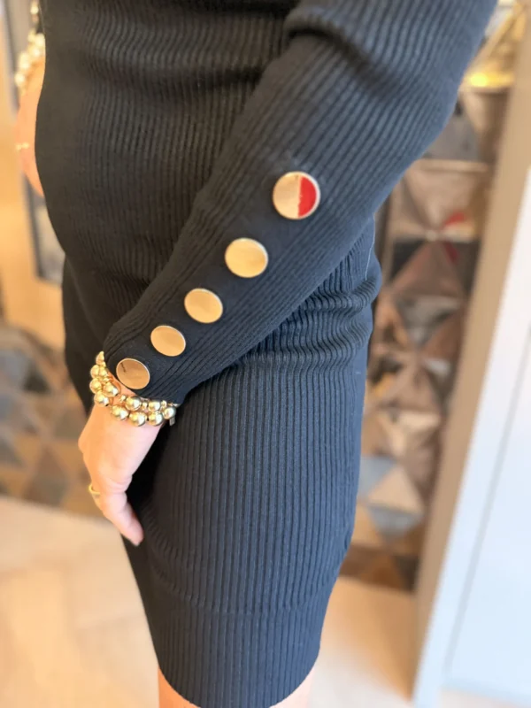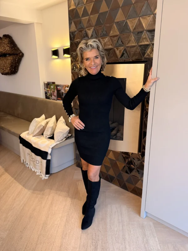 Stoere en elegante lange doorknoopjurk in leatherlook met drukknopen en een bijpassend ceintuur om de taille te accentueren. Voorzien van praktische zakken op het voorpand en kleppen bovenaan. De mouwen zijn afgewerkt met een boordje en drukknoopje voor een verfijnde touch. Een veelzijdige jurk die zowel casual als chique gedragen kan worden.