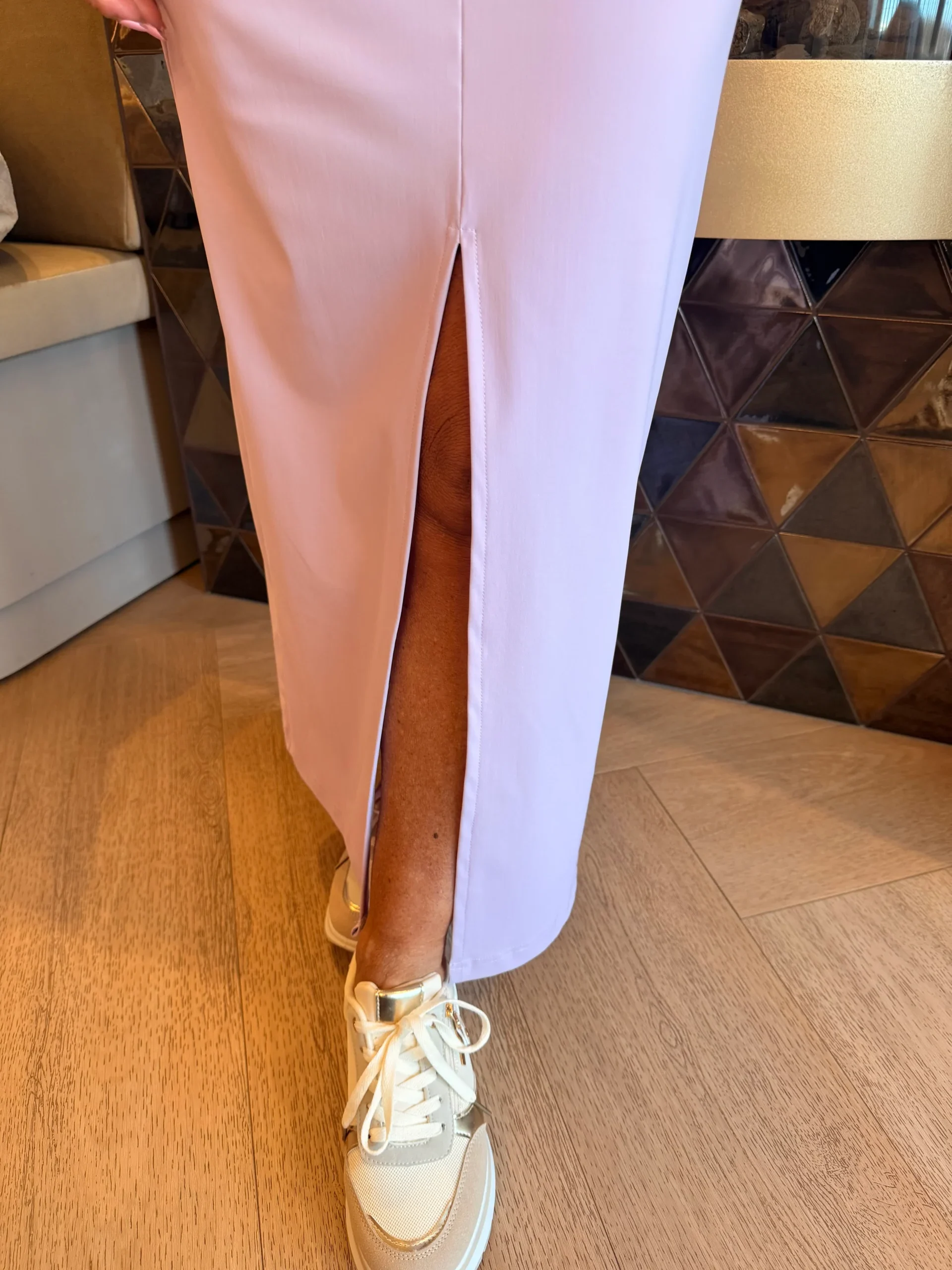 Aan de voorkant zorgt een lange split onderaan voor een speels en vrouwelijk effect, terwijl de lange mouwen zijn afgewerkt met een brede boord en subtiele split voor een verfijnde touch.