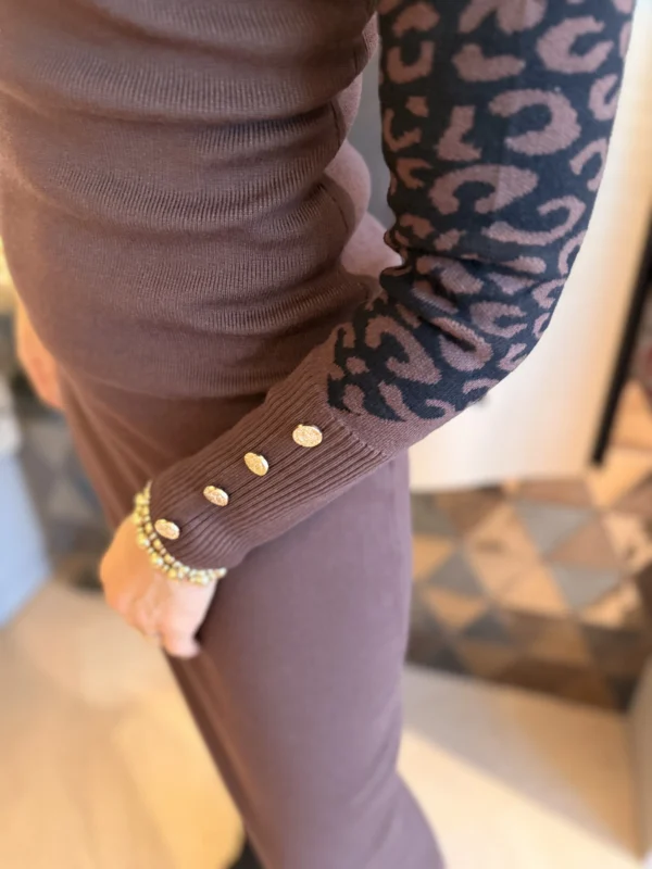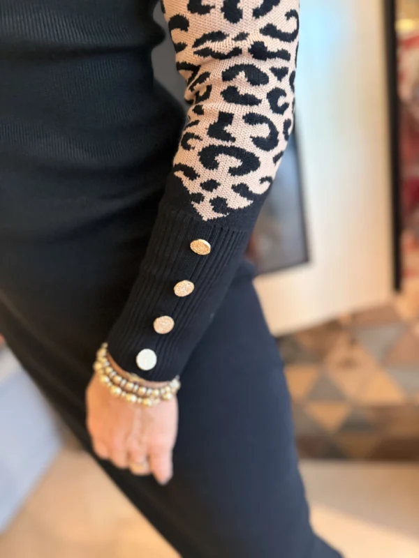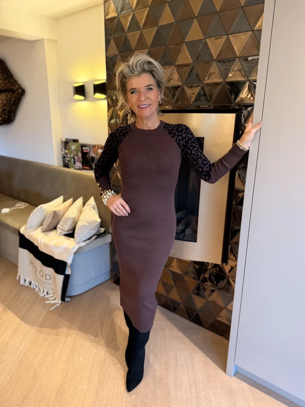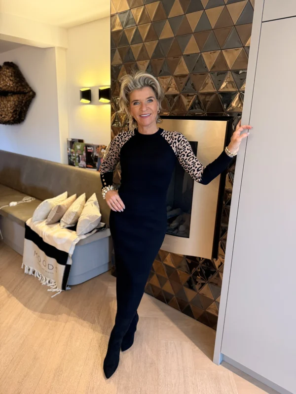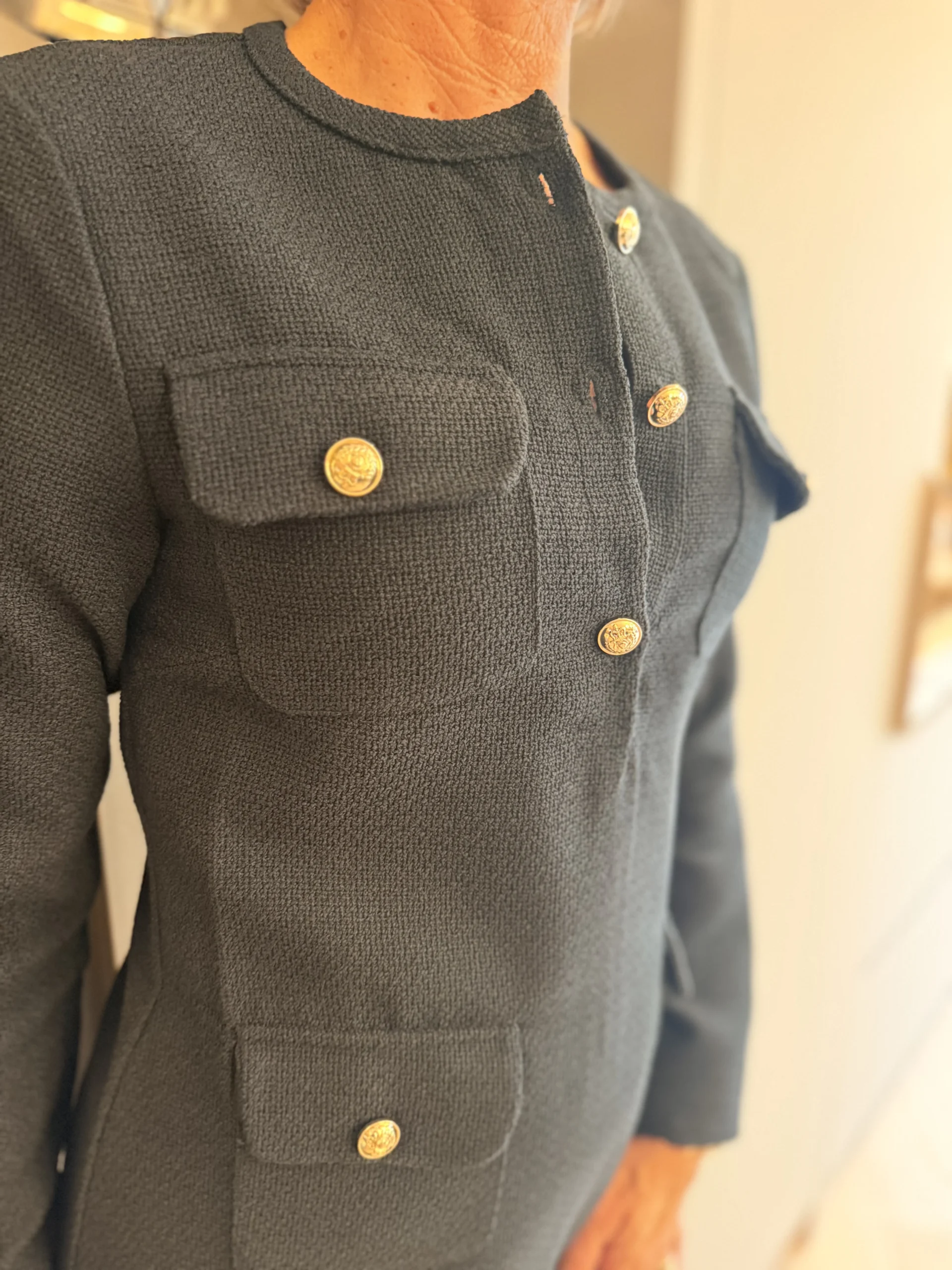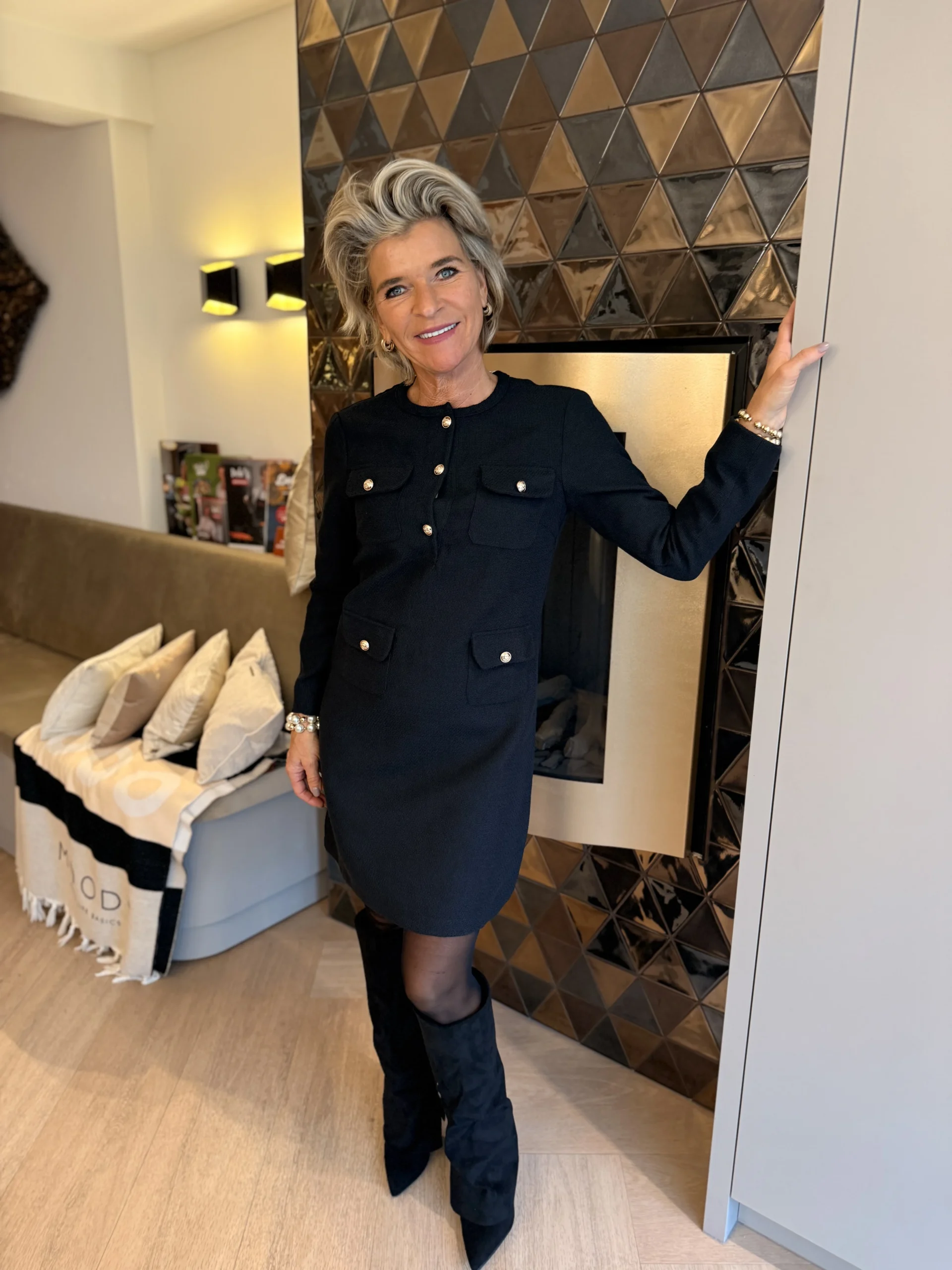 Aan de voorkant zorgen de drie gouden knopen, de twee borstzakjes en twee klepzakjes met gouden knoop voor een chique, tijdloze uitstraling. De rechte lange mouwen maken het jurkje perfect voor zowel werk als een etentje — elegant, vrouwelijk en altijd goed gekleed. De jurk heeft een lengte van ongeveer 87 cm.