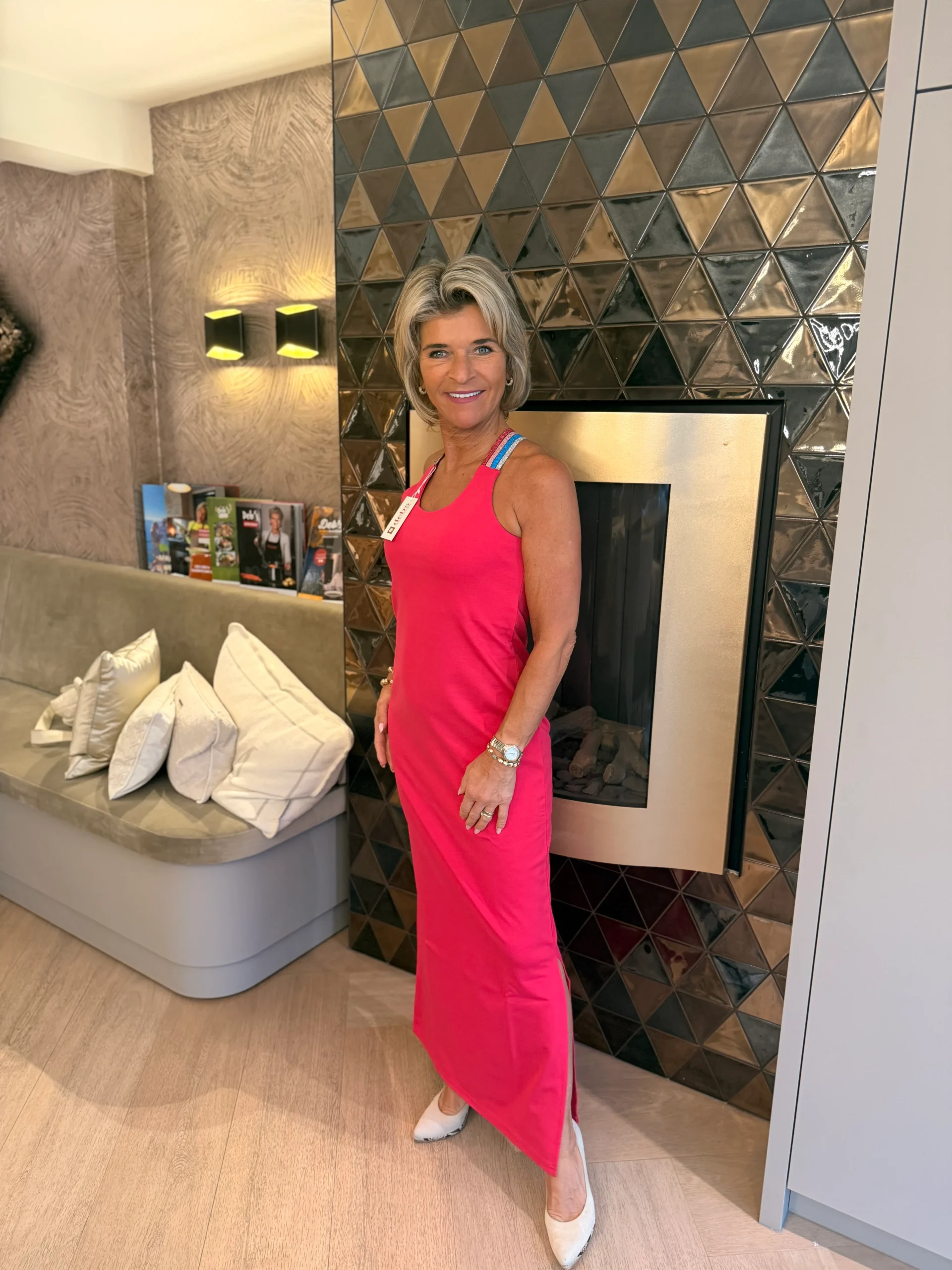 Deze lange zomerjurk met haltertop is een echte eyecatcher voor warme dagen. De speelse kruisbanden in meerdere kleuren geven de jurk een vrolijke, zomerse uitstraling en zorgen voor een elegant silhouet. Aan de achterkant zijn de banden stijlvol gekruist, wat een verfijnd en vrouwelijk detail toevoegt.