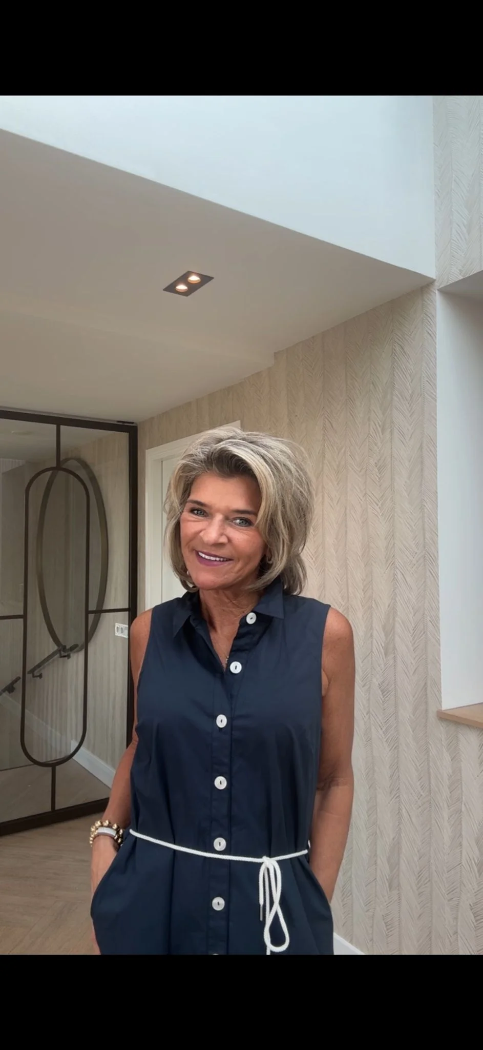 Deze mouwloze jurk met kraag en witte knopen tot onderaan heeft een frisse en tijdloze uitstraling. De doorknoopsluiting geeft de jurk een klassieke touch, terwijl het mouwloze model zorgt voor een luchtige en moderne look.