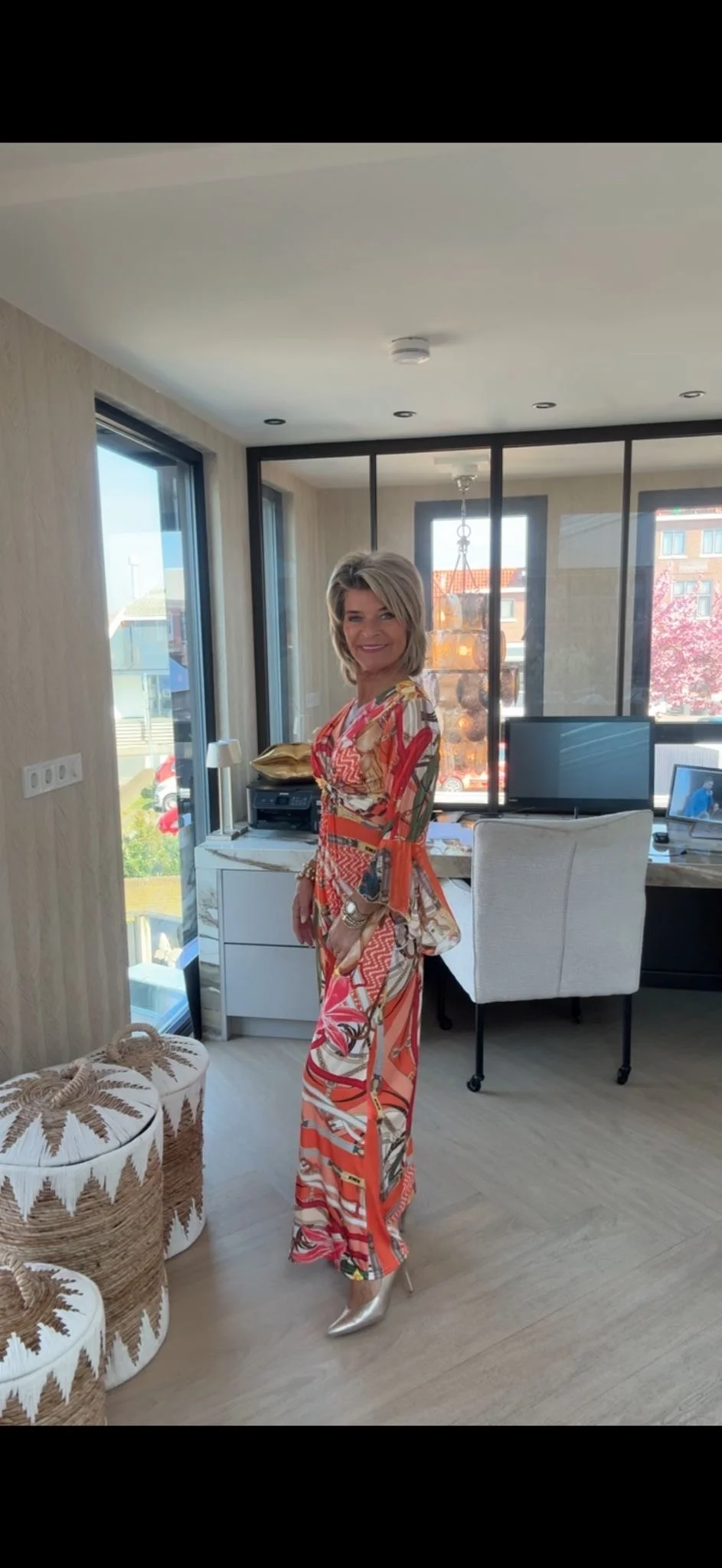 Deze lange jurk heeft een elegante V-hals die in het midden samenkomt in mooie plooien, wat zorgt voor een vrouwelijke en flatterende uitstraling.