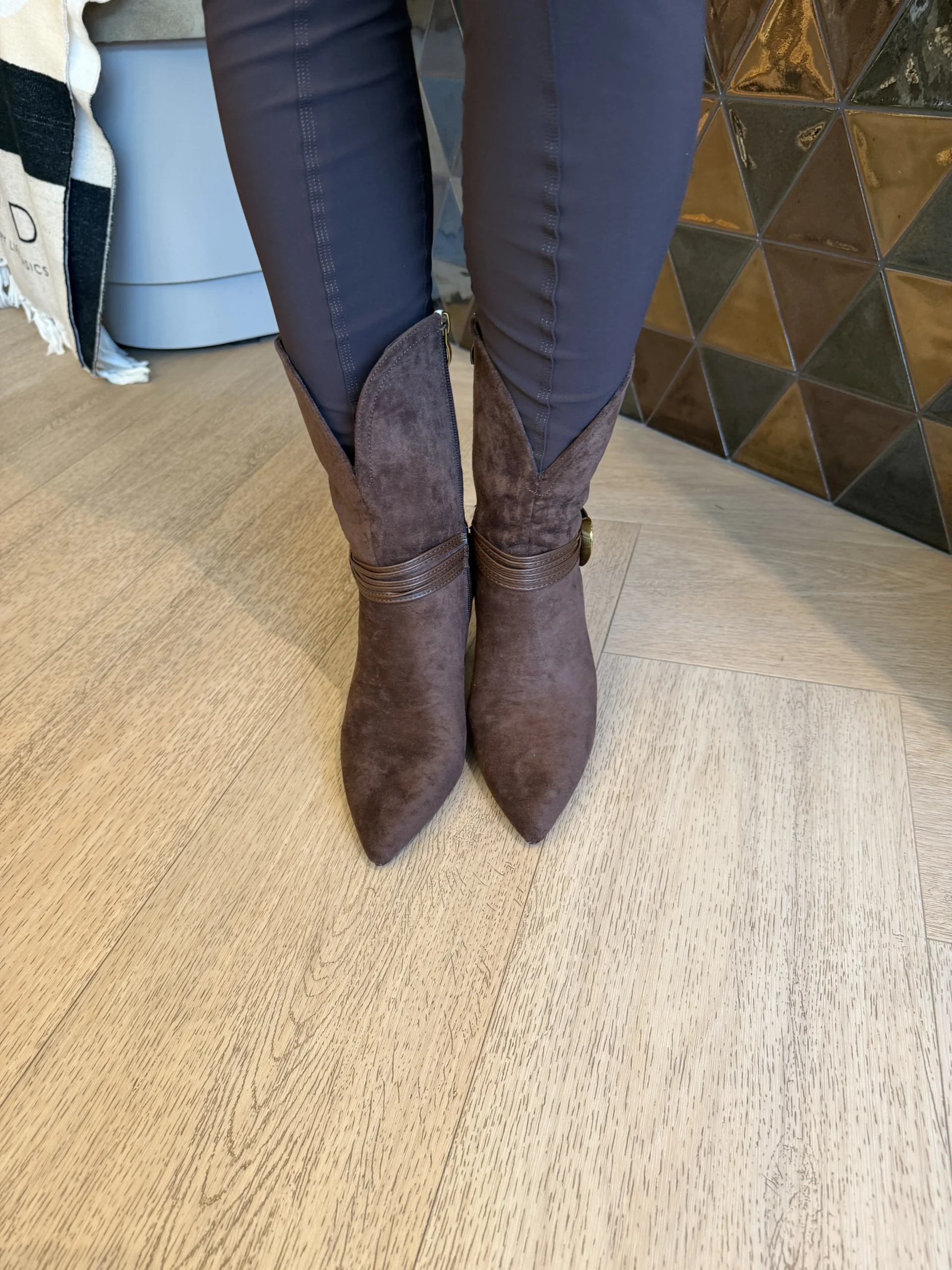 Deze korte laars van suède combineert stoere details met een elegante uitstraling. De spitse neus en de smalle riempjes met gouden gesp zorgen voor een moderne twist, terwijl de hak van 7 cm zorgt voor een comfortabele pasvorm. Perfect te dragen bij zowel jeans als jurken.