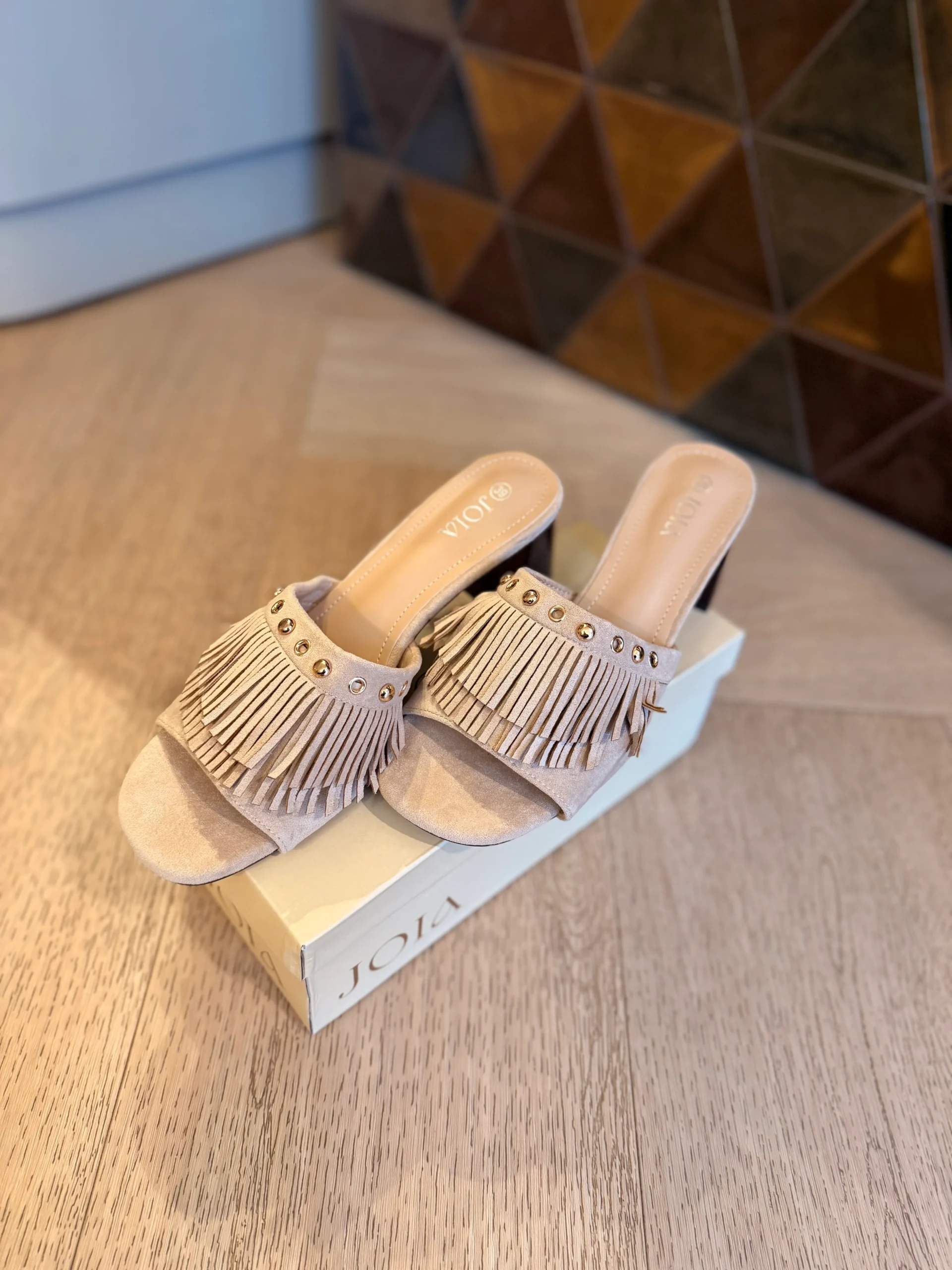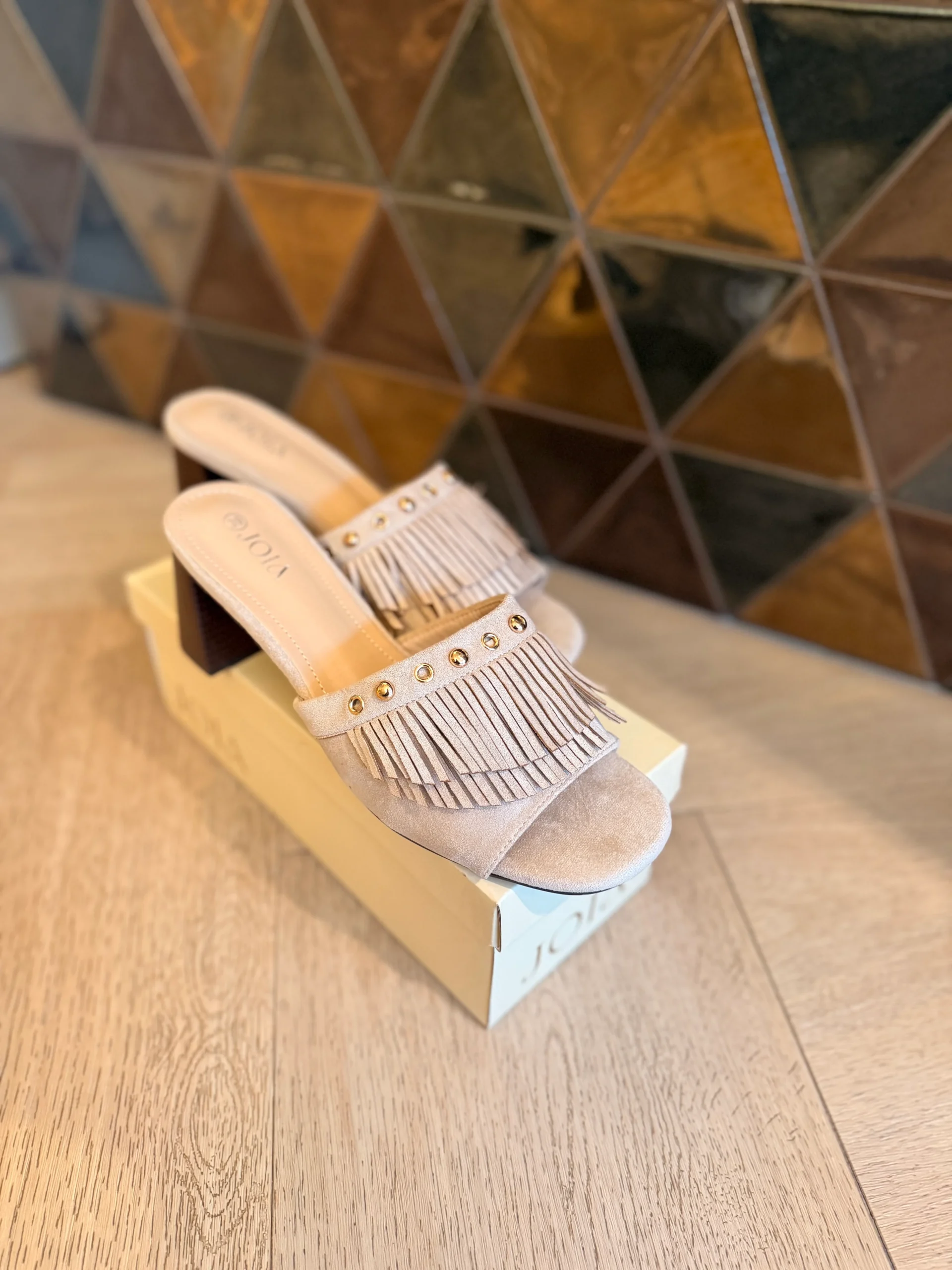 Een stijlvol muiltje met een iets hoger hakje voor een elegante look. De franjers aan de voorkant geven een speels effect, terwijl de studrand erboven zorgt voor een stoer en trendy accent. Een echte eyecatcher die elke outfit compleet maakt.