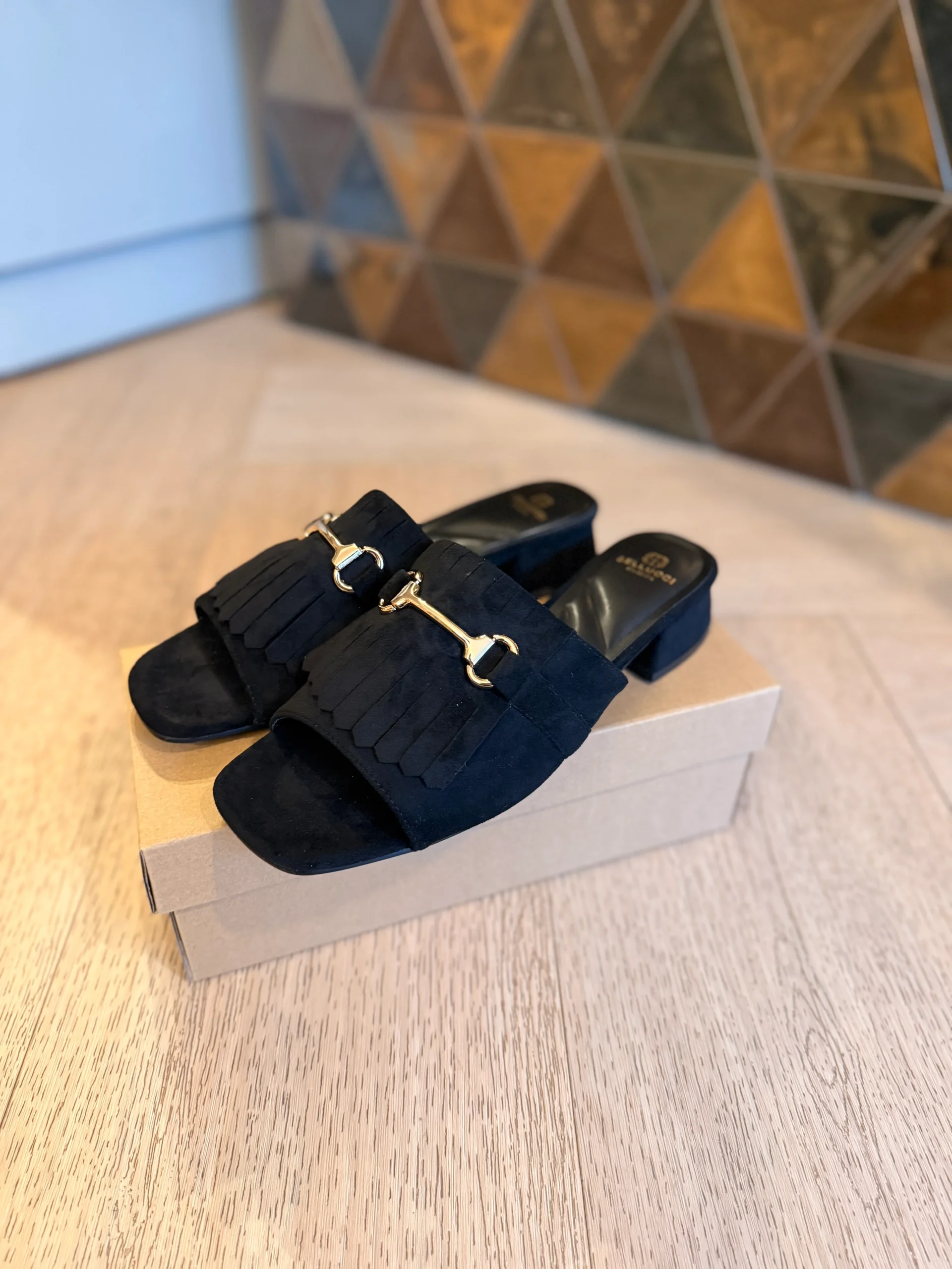 Een elegant muiltje met een klein hakje voor extra comfort. De franjers aan de voorkant geven een speelse touch, terwijl het bit-detail zorgt voor een chique en luxe uitstraling. Perfect om elke outfit net dat beetje extra te geven.
