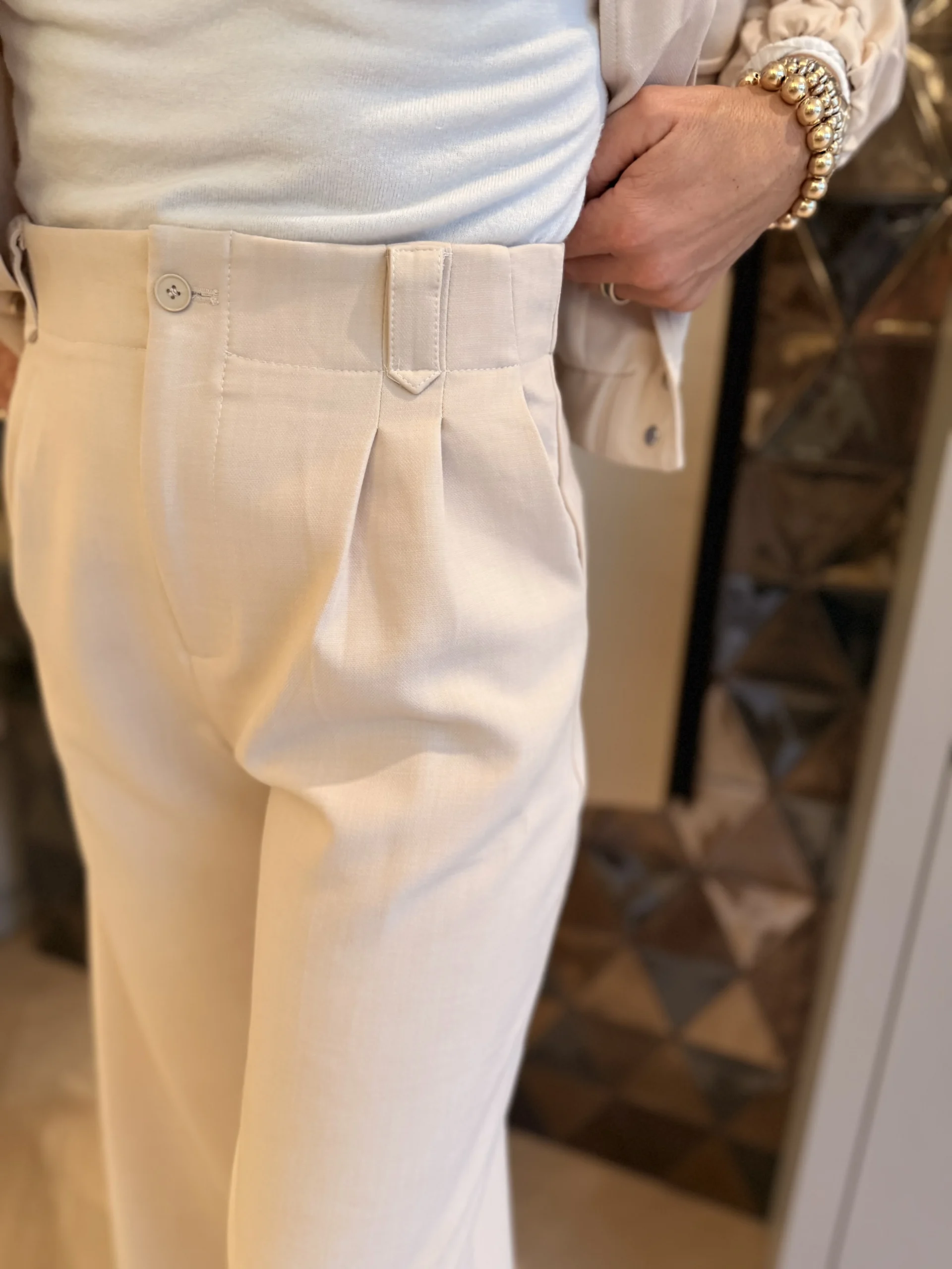 Elegante pantalon met een klassieke knoopsluiting en stijlvolle plooien aan de voorkant voor een verfijnde uitstraling. De comfortabele pasvorm maakt hem perfect voor zowel casual als geklede looks. Combineer met het bijpassende Bomber Jacket voor een complete, moderne outfit.