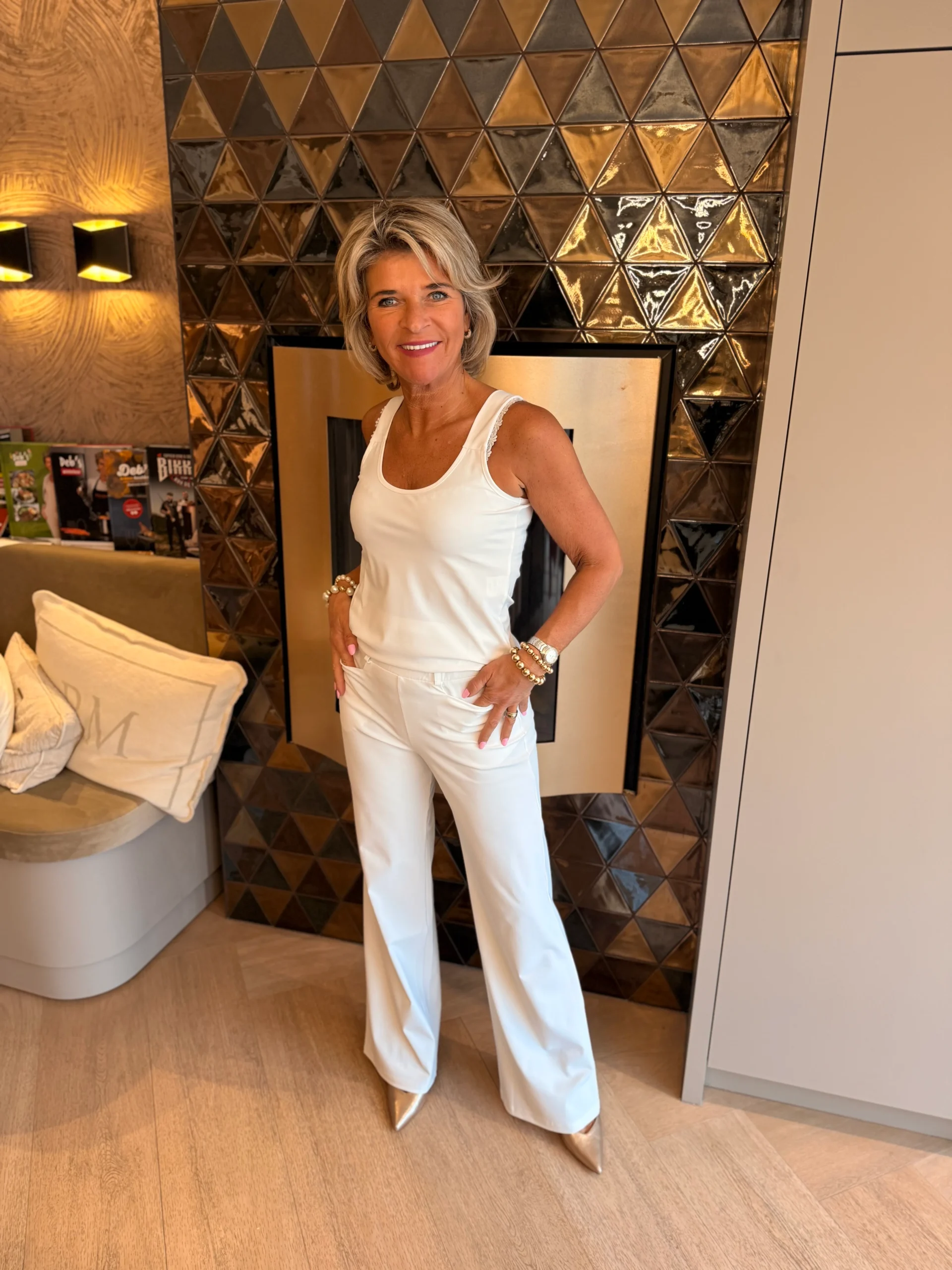 Gemaakt van een mooie, dikke travelkwaliteit: een stevige maar comfortabele stof die soepel valt, mooi in model blijft en nauwelijks kreukt. De brede boord met riemlussen zorgt voor een fijne pasvorm en maakt het mogelijk om de broek zowel casual als chic te stylen met een mooie riem.