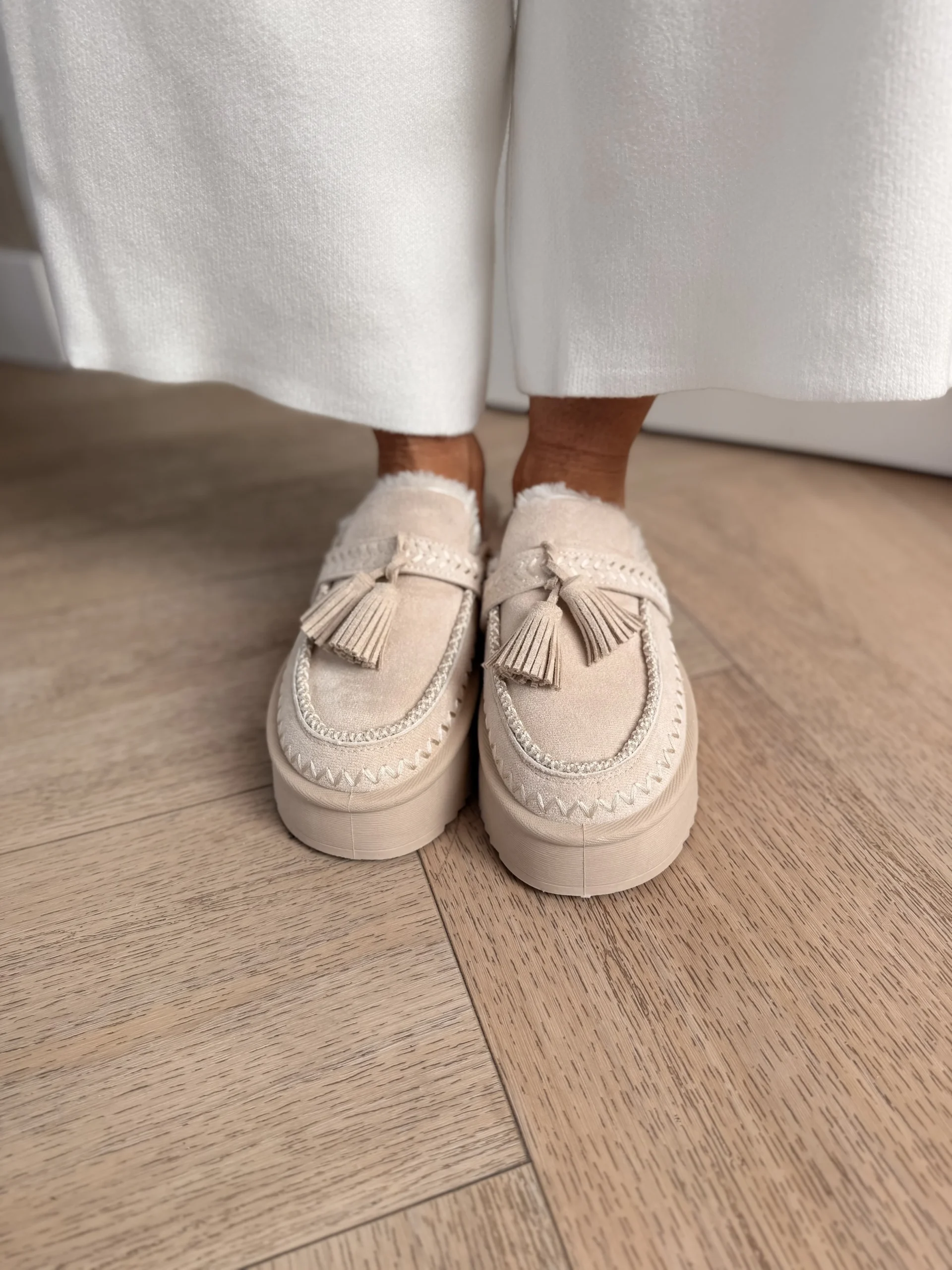 Deze pantoffels combineren comfort en stijl met een stevige, dikke zool en charmante kwastjes op de neus. Ideaal voor cozy dagen in huis met een modieuze twist.