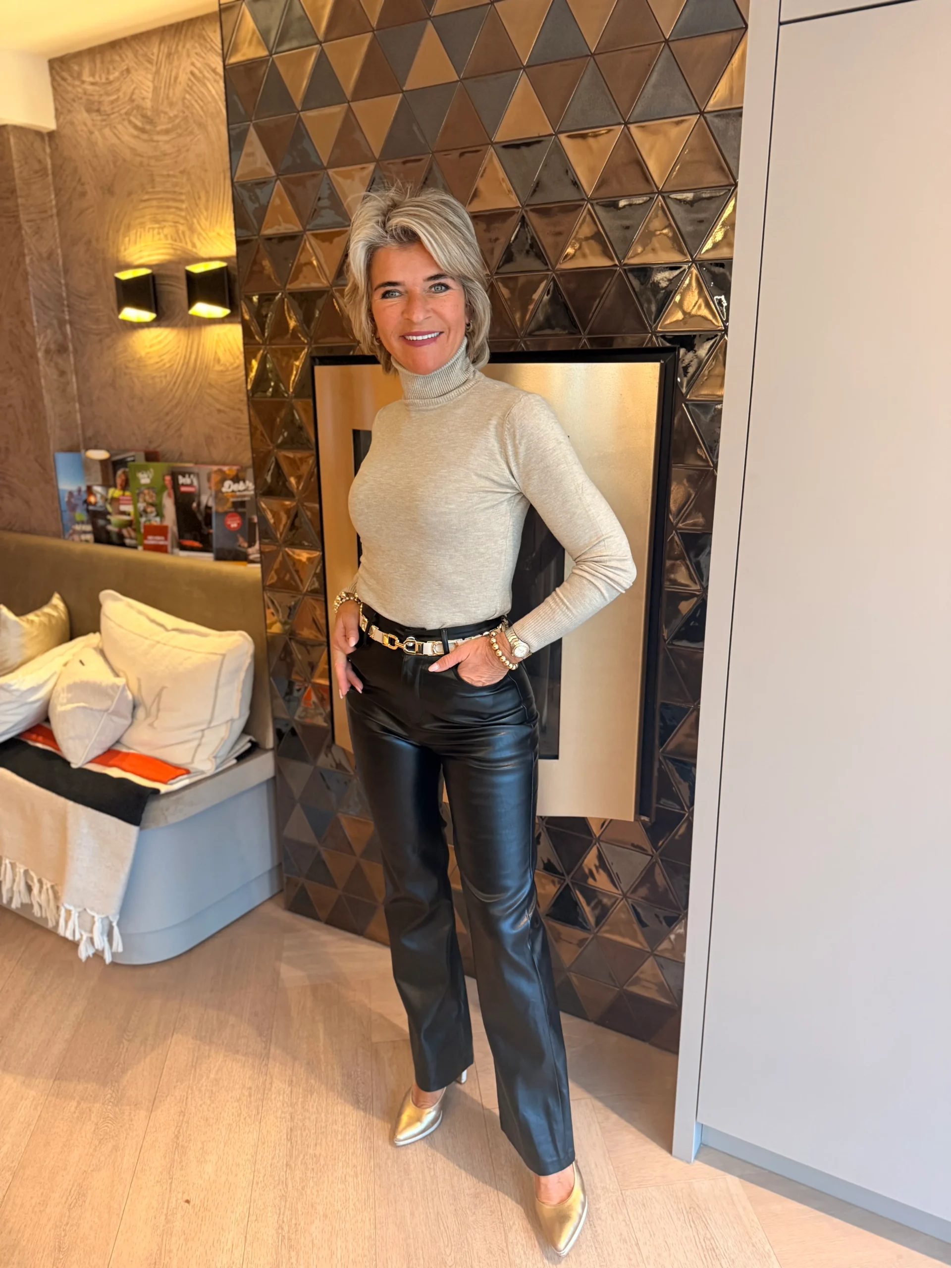 Een elastische riem van 2,5 cm breed met gouden gespen. De riem kan worden uitgerekt tot 125 cm, waardoor hij comfortabel en flexibel is en gemakkelijk op verschillende maten past.
