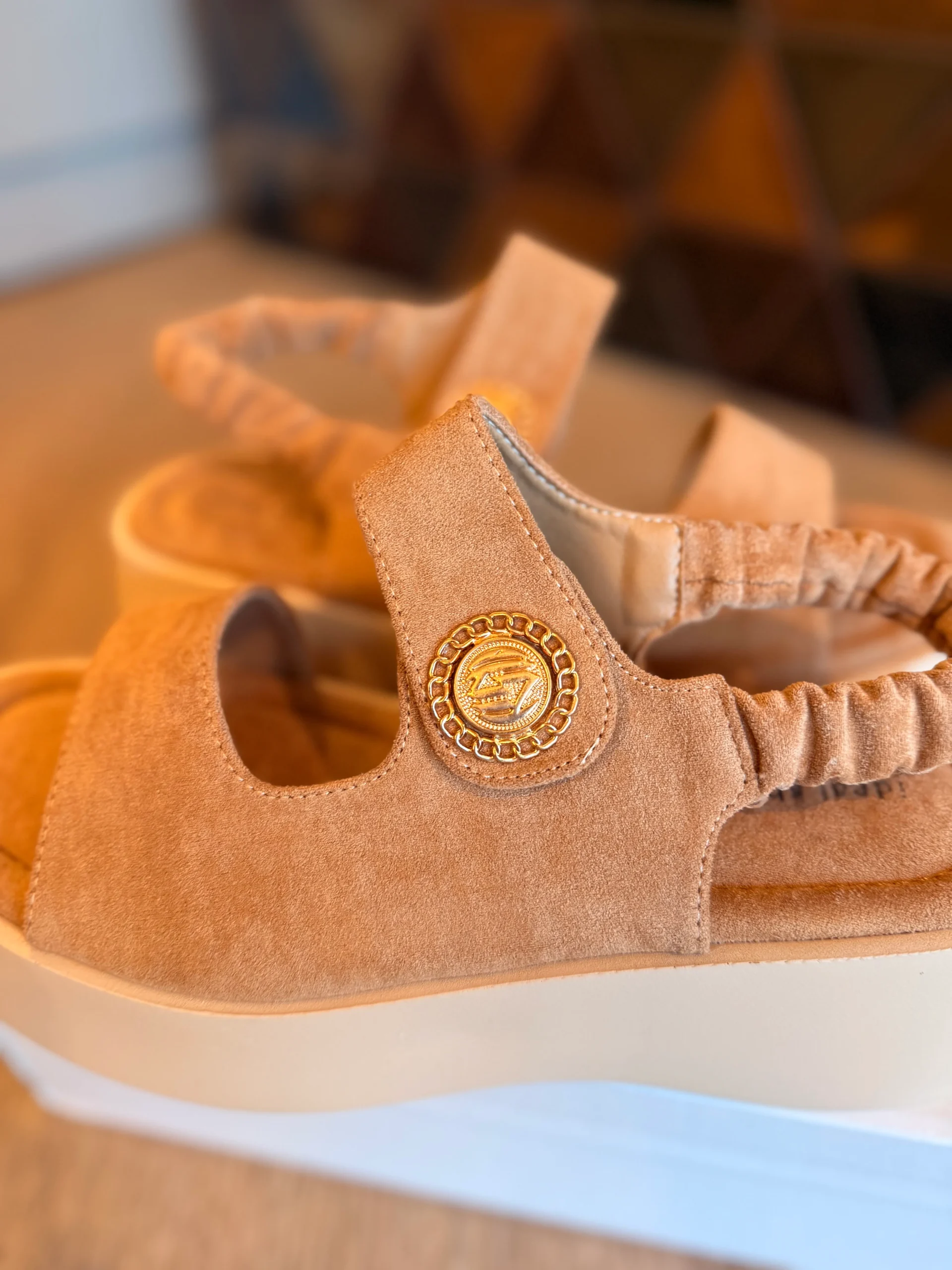 Deze suède sandaal combineert stijl met comfort. De twee banden over de voet en de open teen geven een zomerse, elegante uitstraling. De band kun je verstellen met klittenband. Aan de achterkant zorgt een band met elastiek voor een fijne pasvorm, afgewerkt met een prachtige grote knoop als stijlvol detail. De sandaal heeft een stevige, beige zool die zorgt voor een moderne look, terwijl de suède binnenzool heerlijk zacht aanvoelt. Perfect voor warme dagen waarop comfort en uitstraling samenkomen.