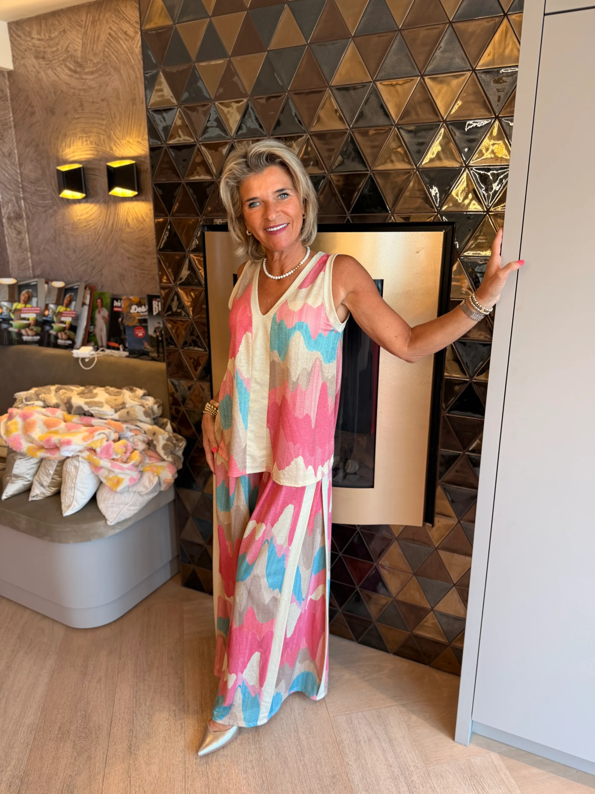 De top heeft dezelfde print en is mouwloos, met zowel aan de voor- als achterkant een elegante V-hals. De beige bies loopt langs de armsgaten, de hals en stijlvol door in het midden naar beneden. Dankzij de one-size fit is de top te dragen tot en met maat L. Lengte top 63 cm.