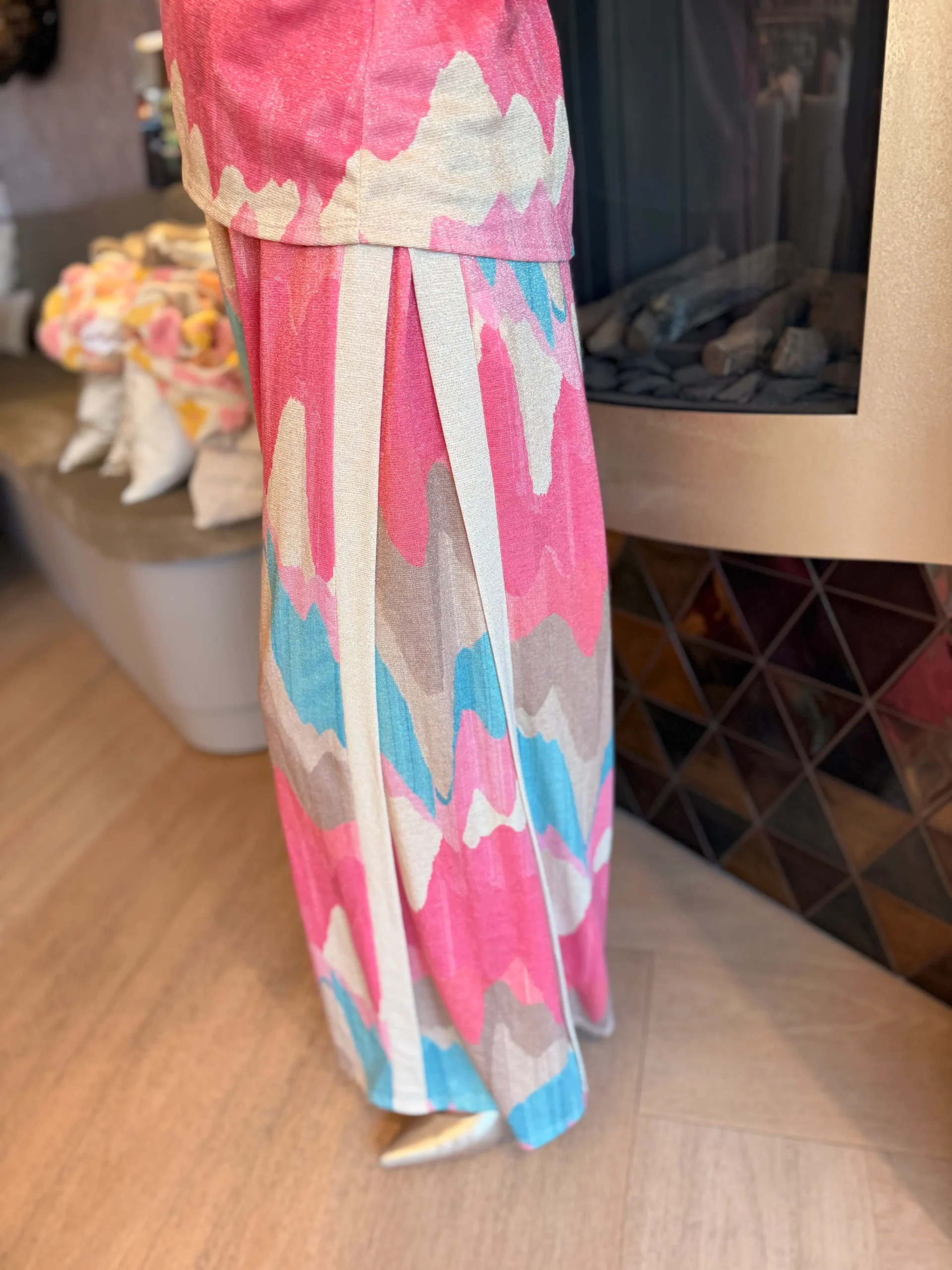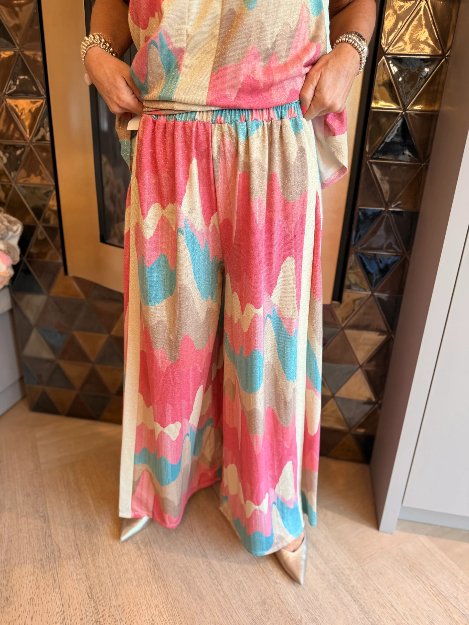 De wijde pantalon heeft rechte pijpen en een comfortabele elastische boord, waardoor hij niet alleen stijlvol maar ook heerlijk draagbaar is. De kleurrijke print geeft een speelse uitstraling, terwijl de beige bies langs de zijkant op het voor en achterpand zorgt voor een subtiel en chic detail. De binnenbeenlengte is 68 cm.